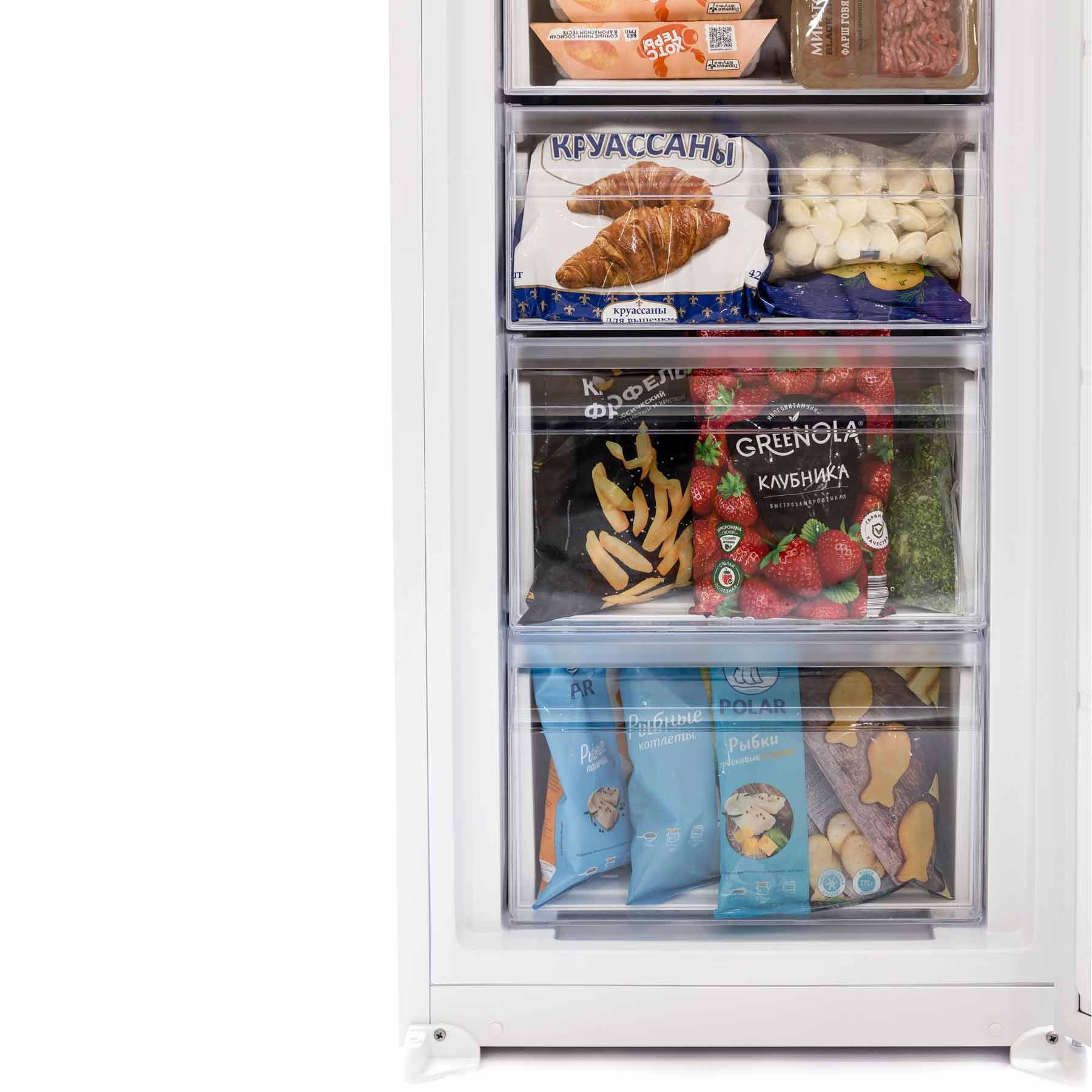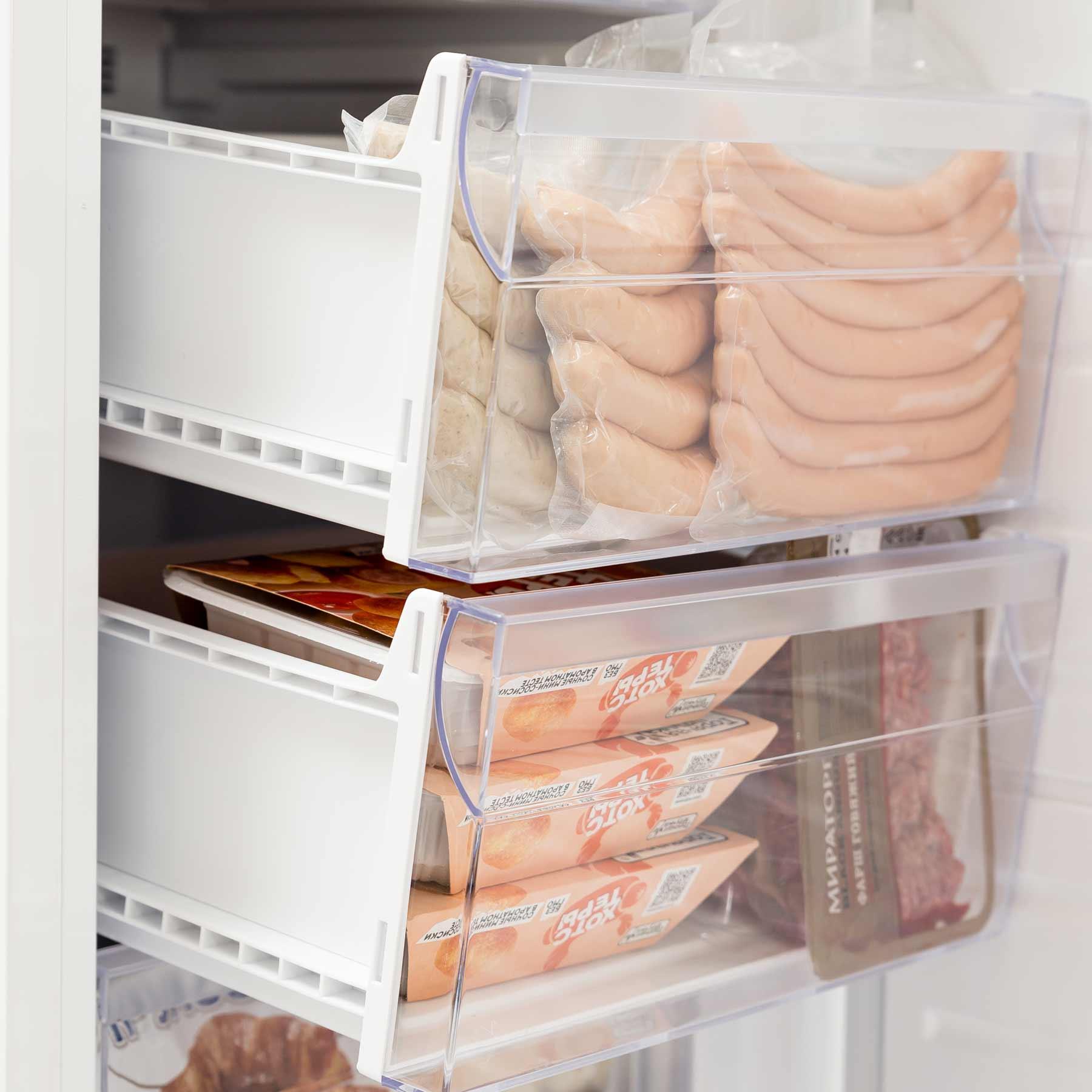 Рассортировать различные продукты позволяют 8 секций для заморозки - 6 выдвижных ящиков + 2 секции с откидывающимися крышками.
