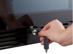 Дверь: Пластиковая рамка, чёрная, открывается слева направо, перенавешиваемая
