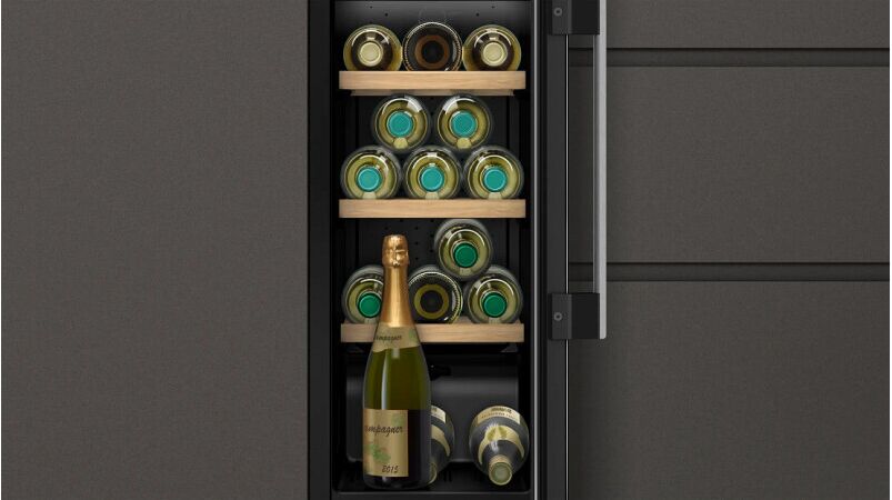 Винный шкаф Neff KU9202HF0 способен вместить в себя до 21 бутылки игристого вина (либо обычных винных бутылок без утолщённой нижней части). Сверху на приборе расположен цифровой дисплей, на котором отображается вся необходимая информация про текущую температуру, режим работы и прочие аспекты. Дверь выполнена из специального затемнённого стекла, которое не пропускает внутрь ультрафиолетовые лучи. В результате вино не подвергается негативному влиянию солнечного света, и всегда остаётся в своём наилучшем состоянии.