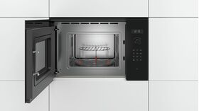 Роликовая подставка микроволновой печи Bosch BFL520MS0 обеспечивает надежное и плавное вращение стеклянного поддона для равномерного подогрева. Подсветка позволяет следить за процессом внутри камеры. Устройство снабжено простыми механическими переключателями для регулировки мощности и установки таймера, что позволяет выбирать оптимальные настройки для приготовления, разморозки и нагрева за считаные секунды. Устройство автоматически отключается при перегрузках и сильных перепадах напряжения. Встроенный вентилятор защищает его от перегрева.