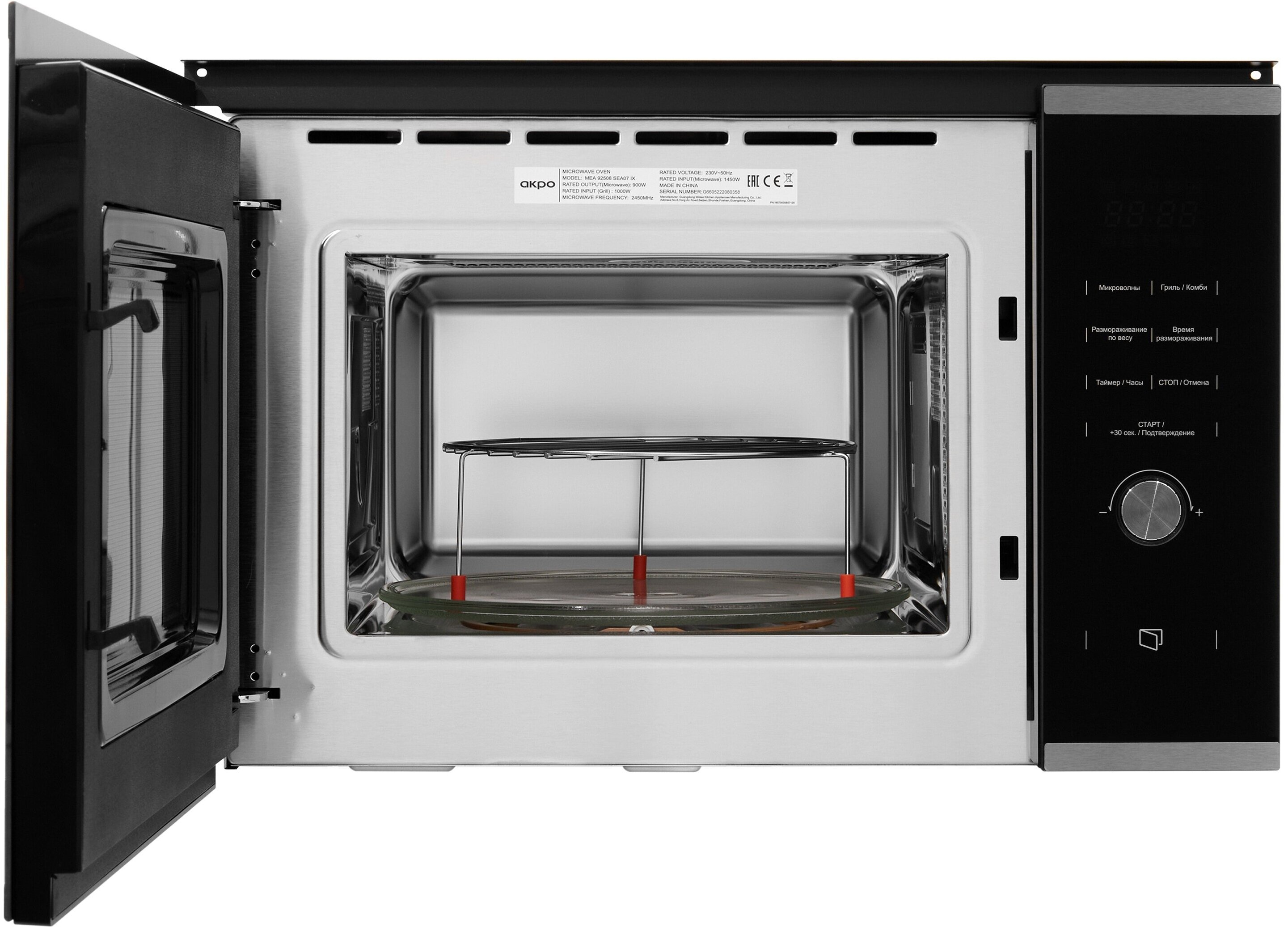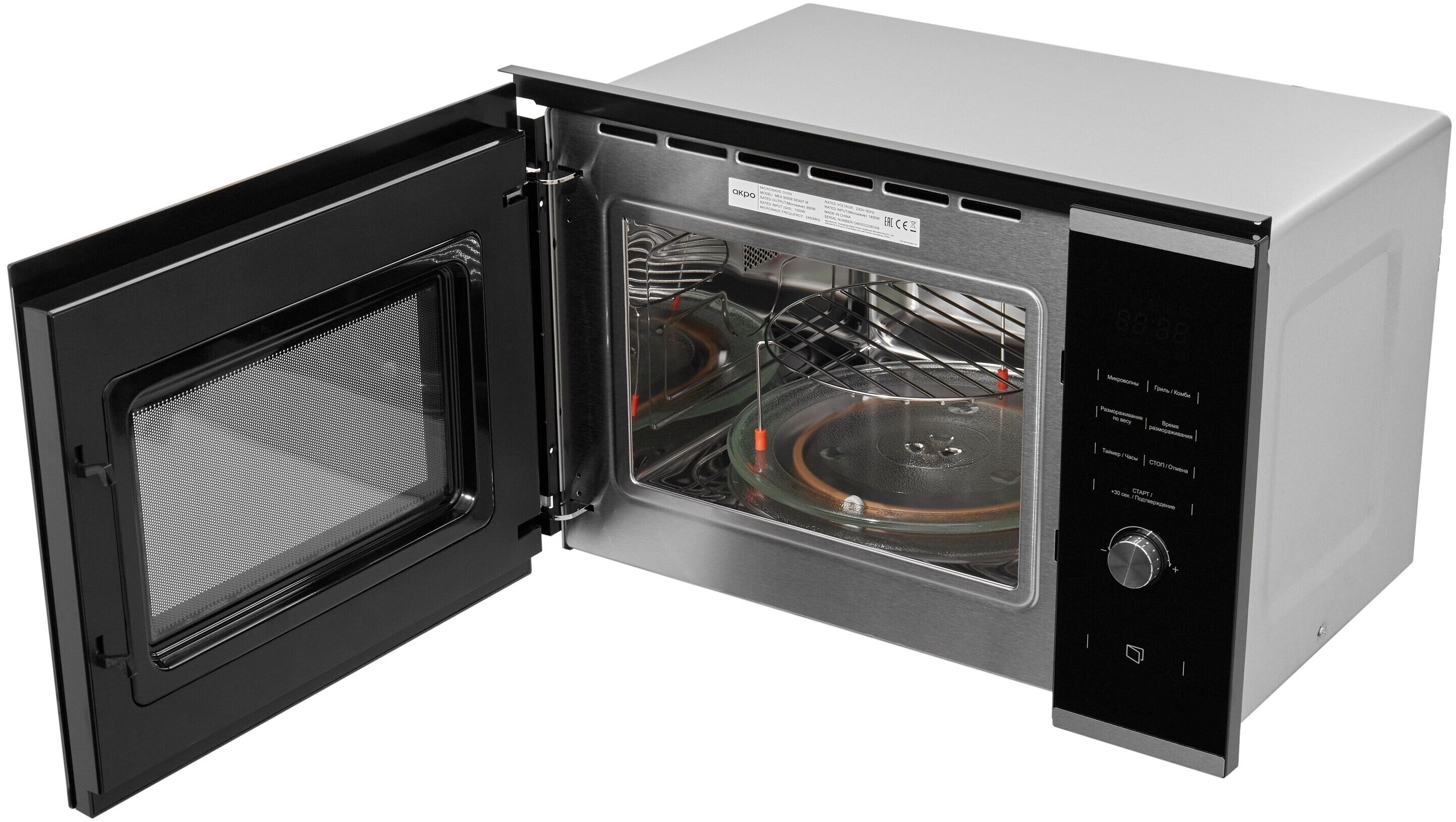 Микроволновая печь, гарантийный талон, круглый стеклянный поддон, решетка для гриля, руководство пользователя