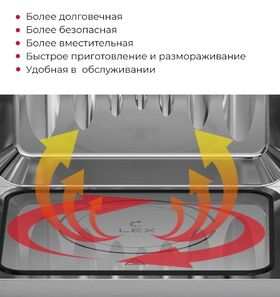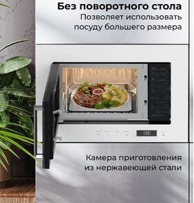 Дно, покрытое керамическим слоем, позволяет волнам распределяться равномерно, обрабатывать продукты со всех сторон. Отсутствие столика даёт возможность использовать вместительную посуду и противни , квадратные и прямоугольные тарелки при сохранении компактности камеры приготовления 20 литров.