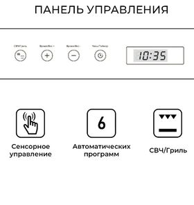 В распоряжении пользователя 6 автопрограмм, которые сделают приготовление разнообразных блюд простым и быстрым. Также вы можете готовить на гриле мощностью 800Вт, разогревать и размораживать продукты.
