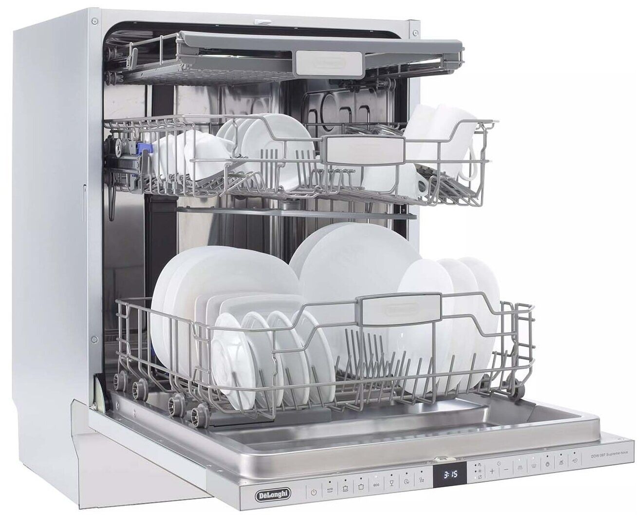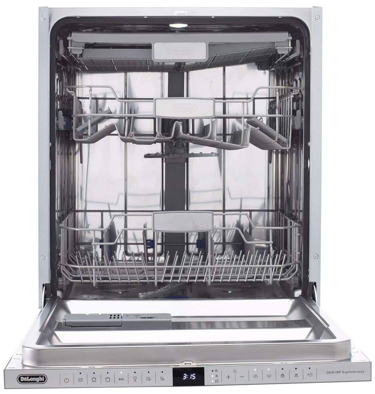 внутренняя поверхность из нержавеющей стали, дисплей, использование средств 3 в 1, регулируемая по высоте корзина для посуды, сенсор чистоты воды