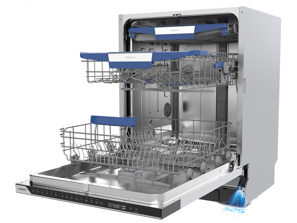 выдвижной лоток и верхняя корзина с регулировкой по высоте; складные полки для чашек, складные направляющие для посуды