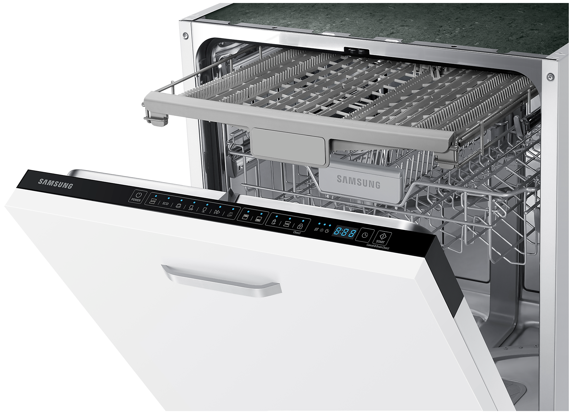 3я корзина, Поддон для столовых приборов, Половинная загрузка, Регулировка высоты корзин