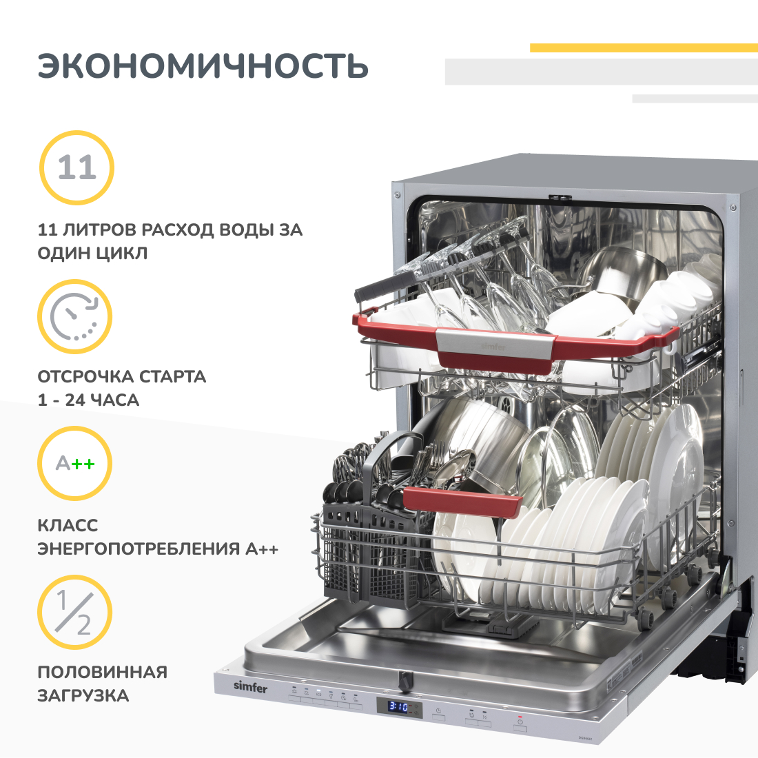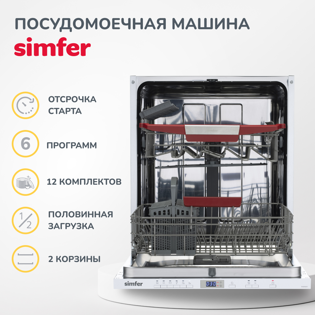 Все эти характеристики делают посудомоечную машину Simfer DGB6601 надежным помощником на вашей кухне. Благодаря ей вы сможете сэкономить время и без усилий получить идеально чистую и высушенную посуду!