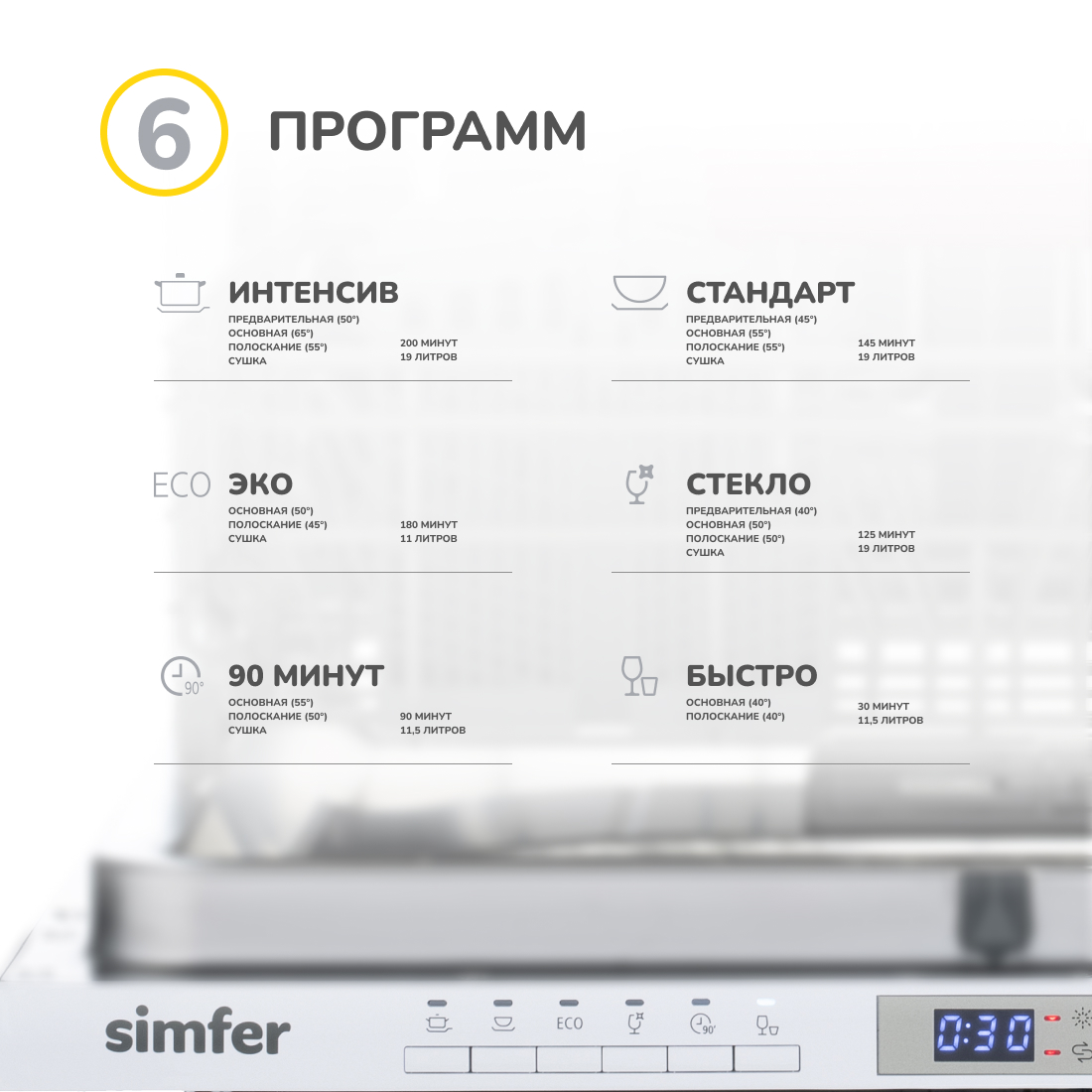 -6 программ мойки, включая: интенсивную, стандартную, экономичную, программу для стекла, быструю программу на 30 минут и программу на 90 минут обеспечат оптимальную чистку для различных видов посуды.