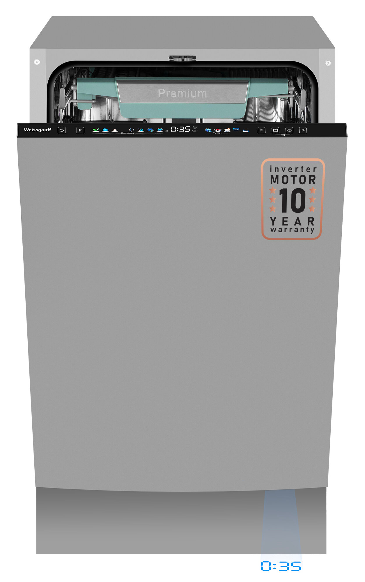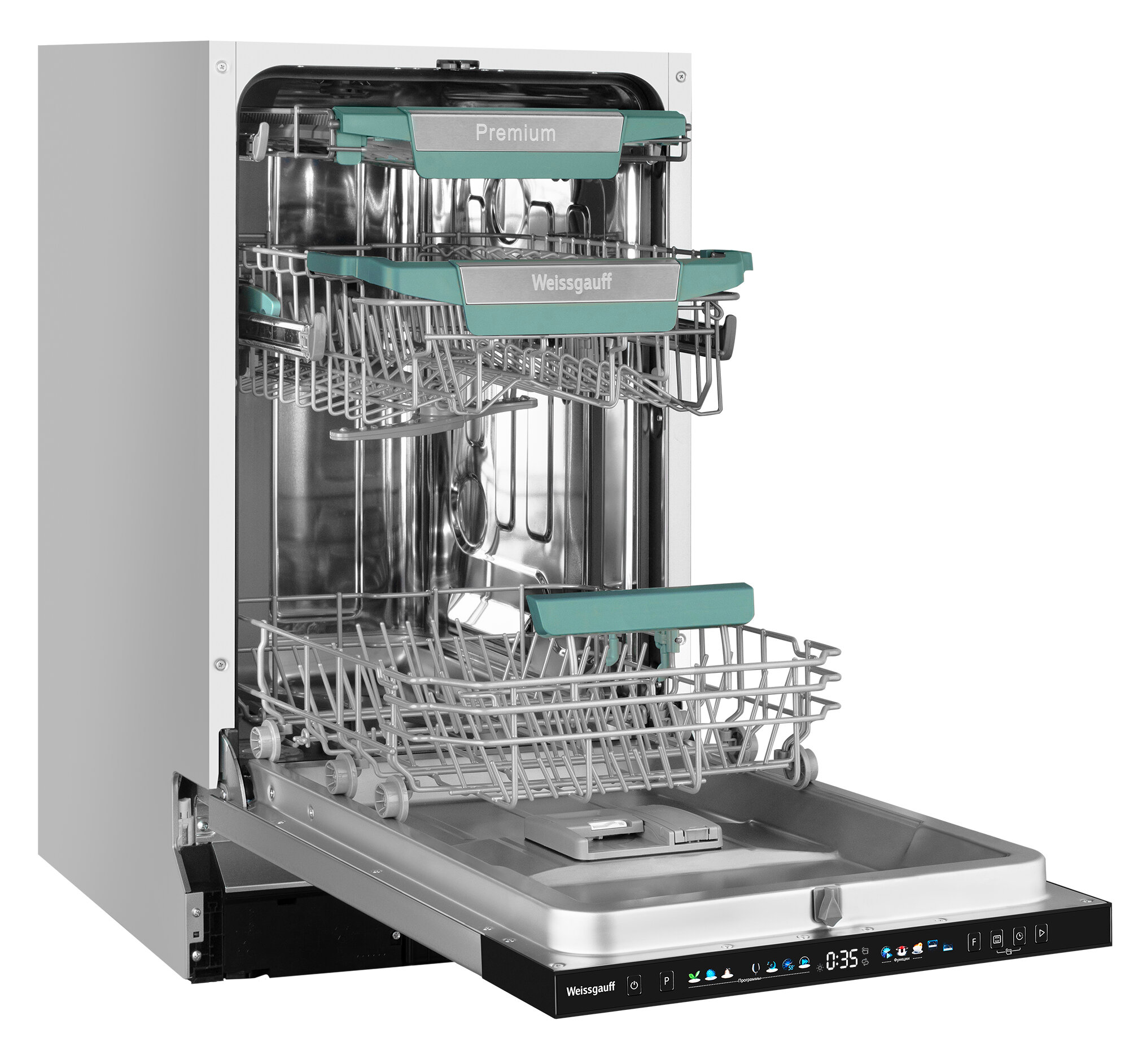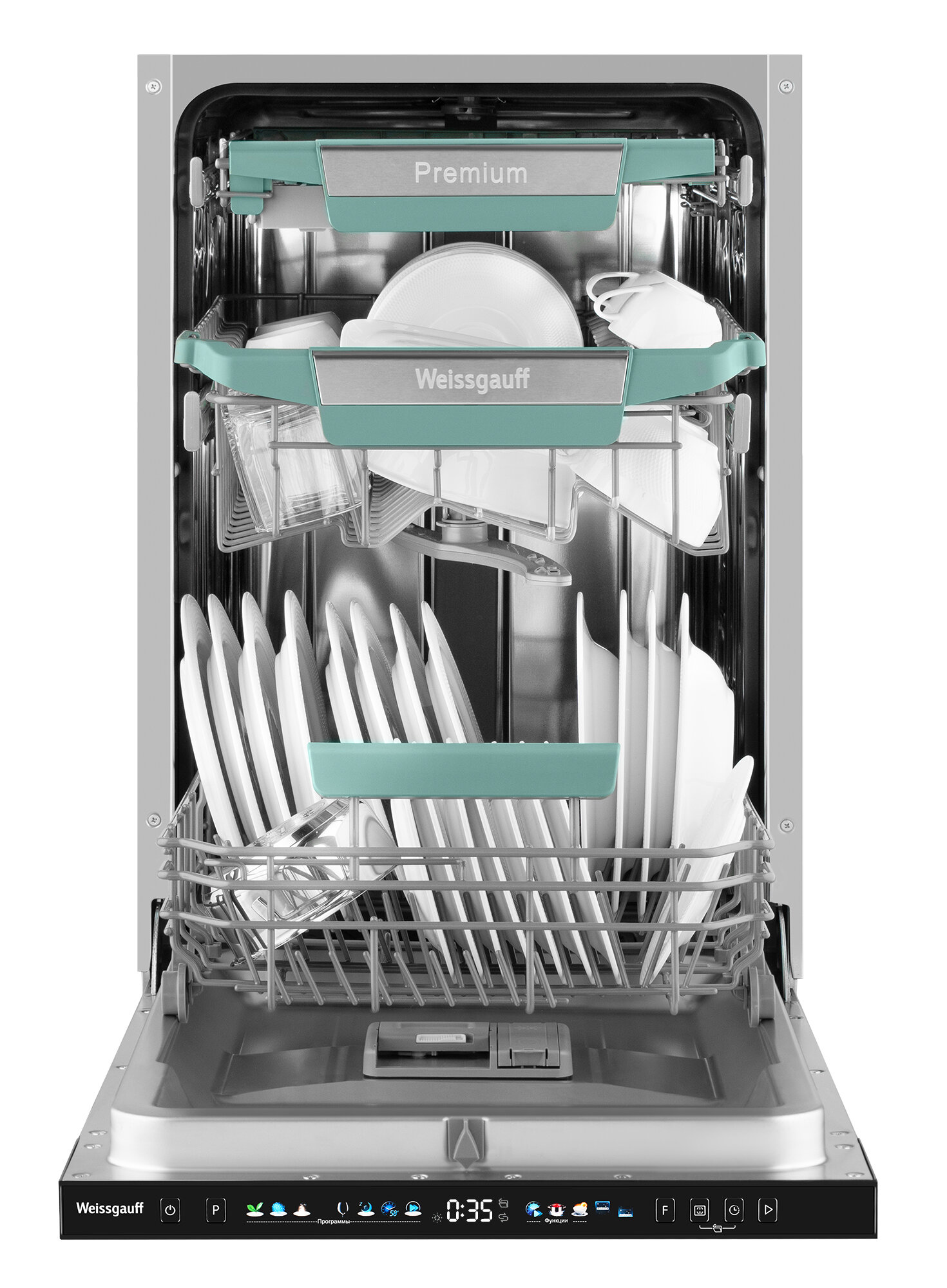 Три корзины, Функция Timer floor, Инверторный двигатель, Цветной дисплей SMART SCREEN, Автоматическое открывание дверцы AutoOpen, Опция Turbo Speed+, До 10 комплектов посуды, Внутренняя подсветка, Половина загрузки, Автопрограмма Blitz Wash, Полностью электронное управление, Возможность дозагрузки посуды, Дополнительная сушка, Таймер до 24 часов