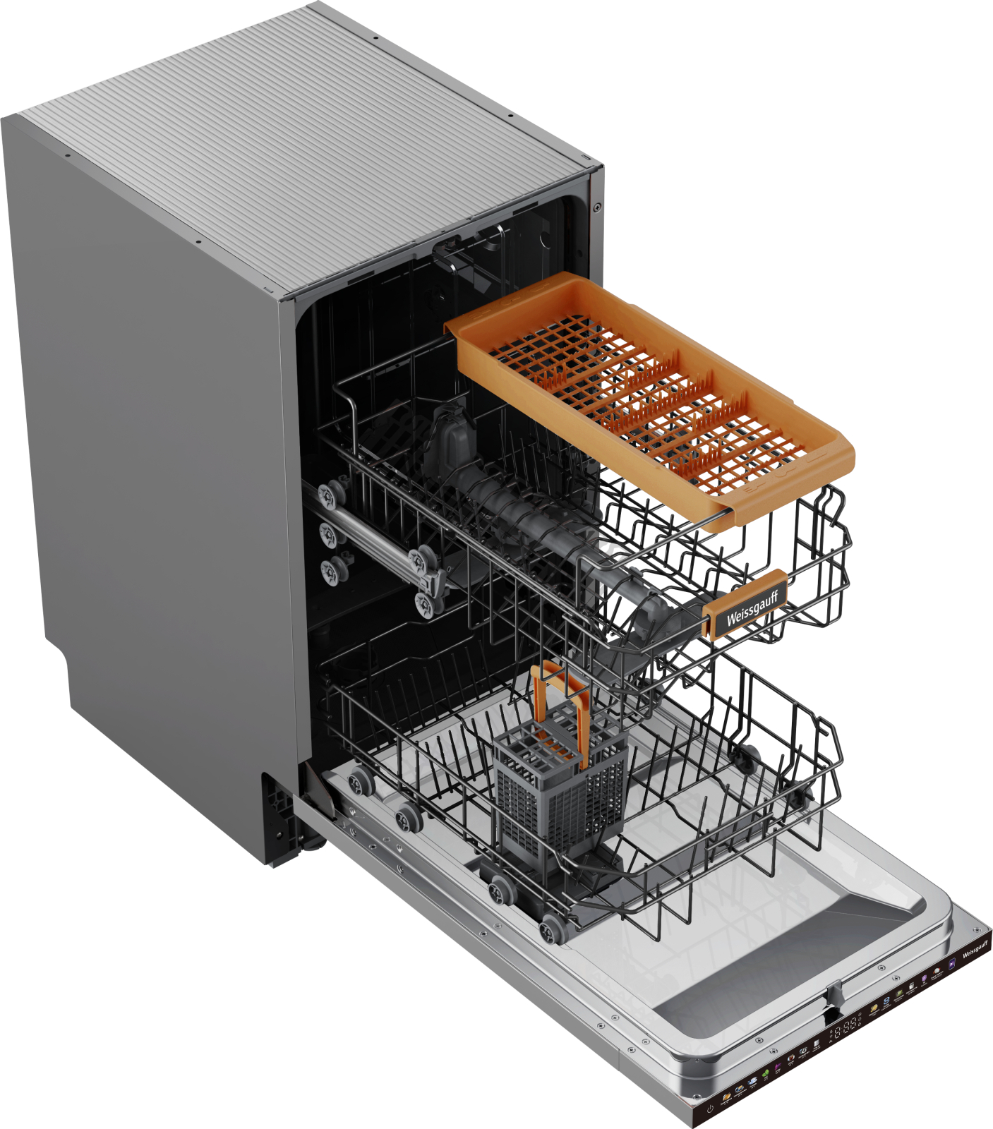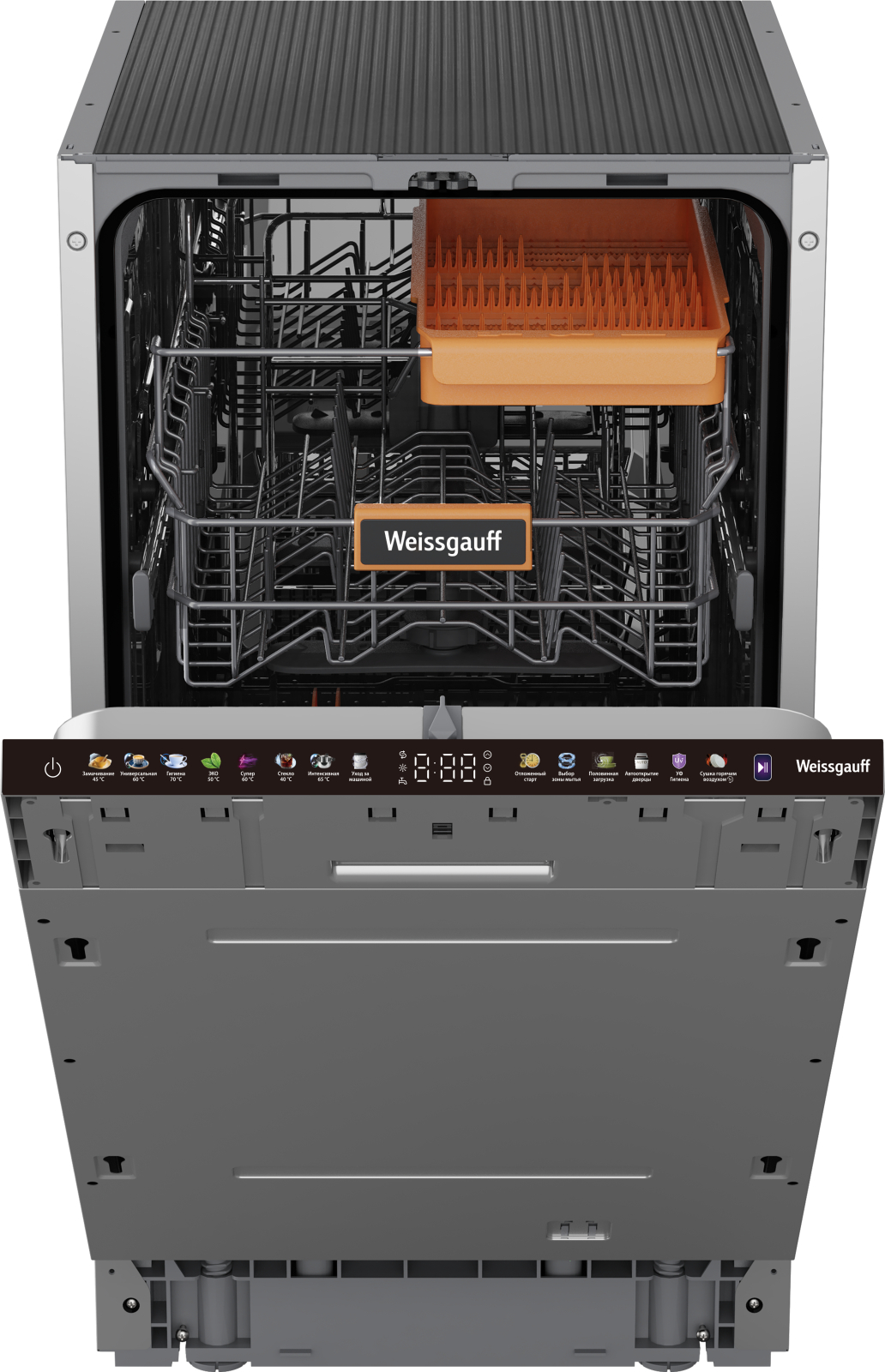 Программы : Замачивание 45 °C, Универсальная 60 °C, Гигиена 70 °C, ЭКО 50 °C, Супер 60 °C, Стекло 40 °C, Интенсивная 65 °C, Уход за машиной