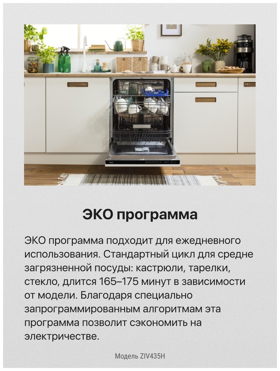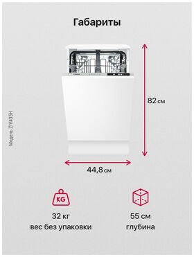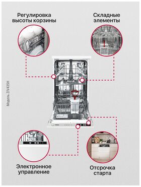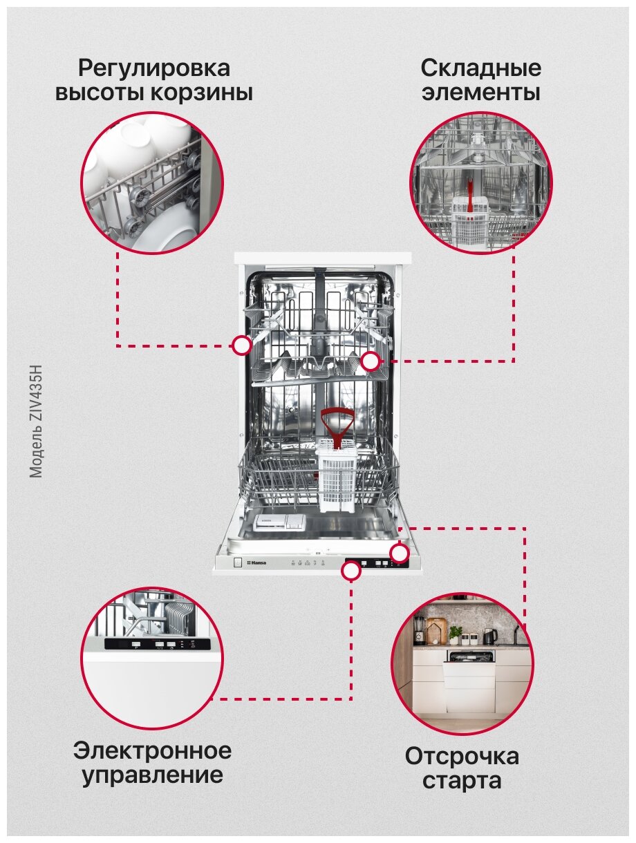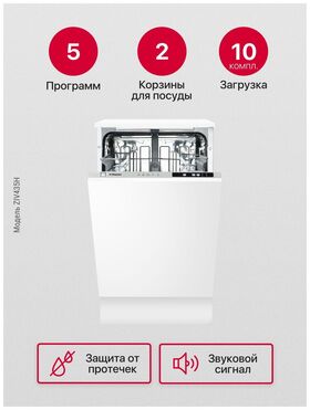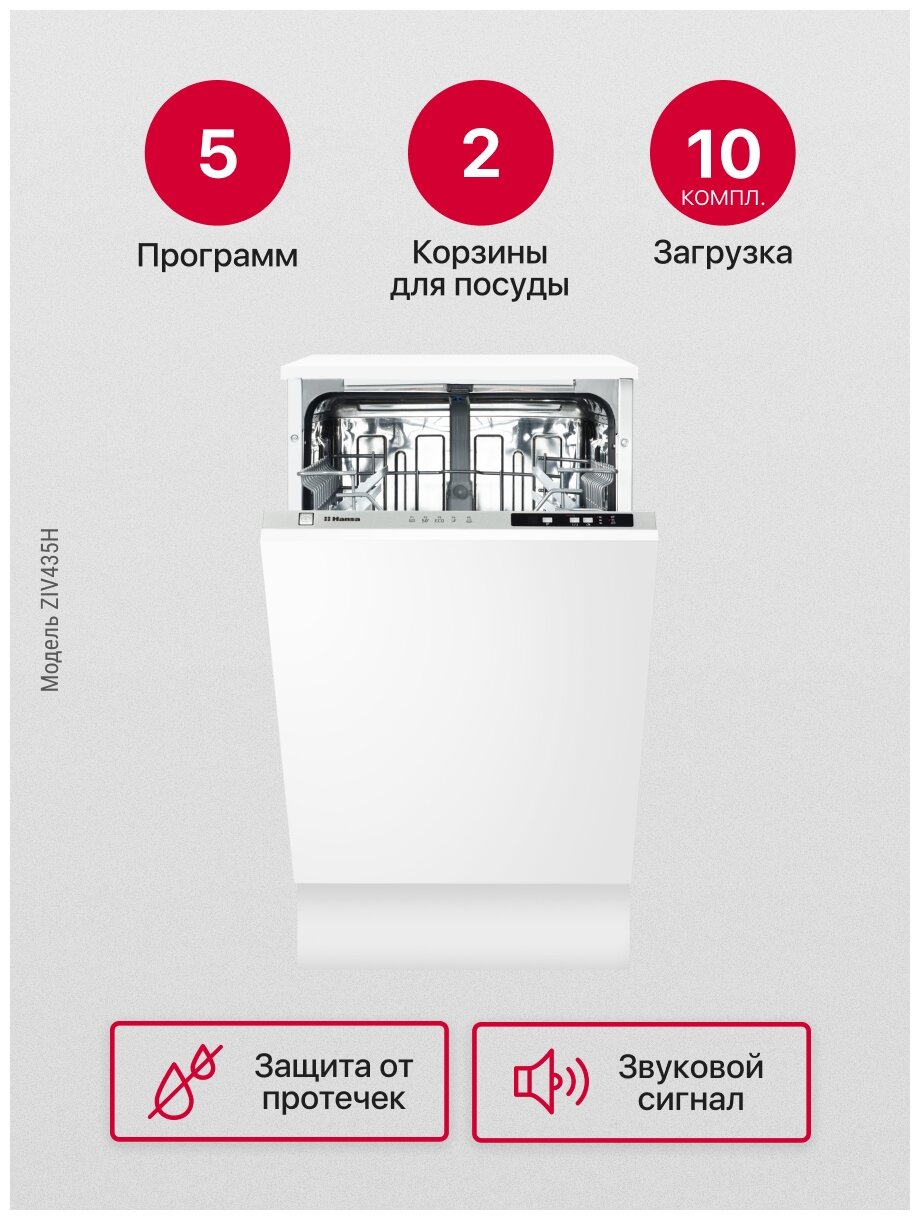 Встраиваемая посудомоечная машина шириной 45 см отлично впишется в любой интерьер и не займет много места. Она создана для тех, кто любит простоту и функциональность, и имеет все самое необходимое для комфортного использования – 5 программ для посуды любой степени загрязненности, функцию половинной загрузки и таймер отсрочки запуска на 3, 6 или 9 часов. Загружайте в машину до 10 комплектов посуды и пользуйтесь ей в любое удобное вам время, даже ночью! О протечках можете не беспокоиться – в случае накопления воды в поддоне система AquaStop автоматически прекратит подачу воды.