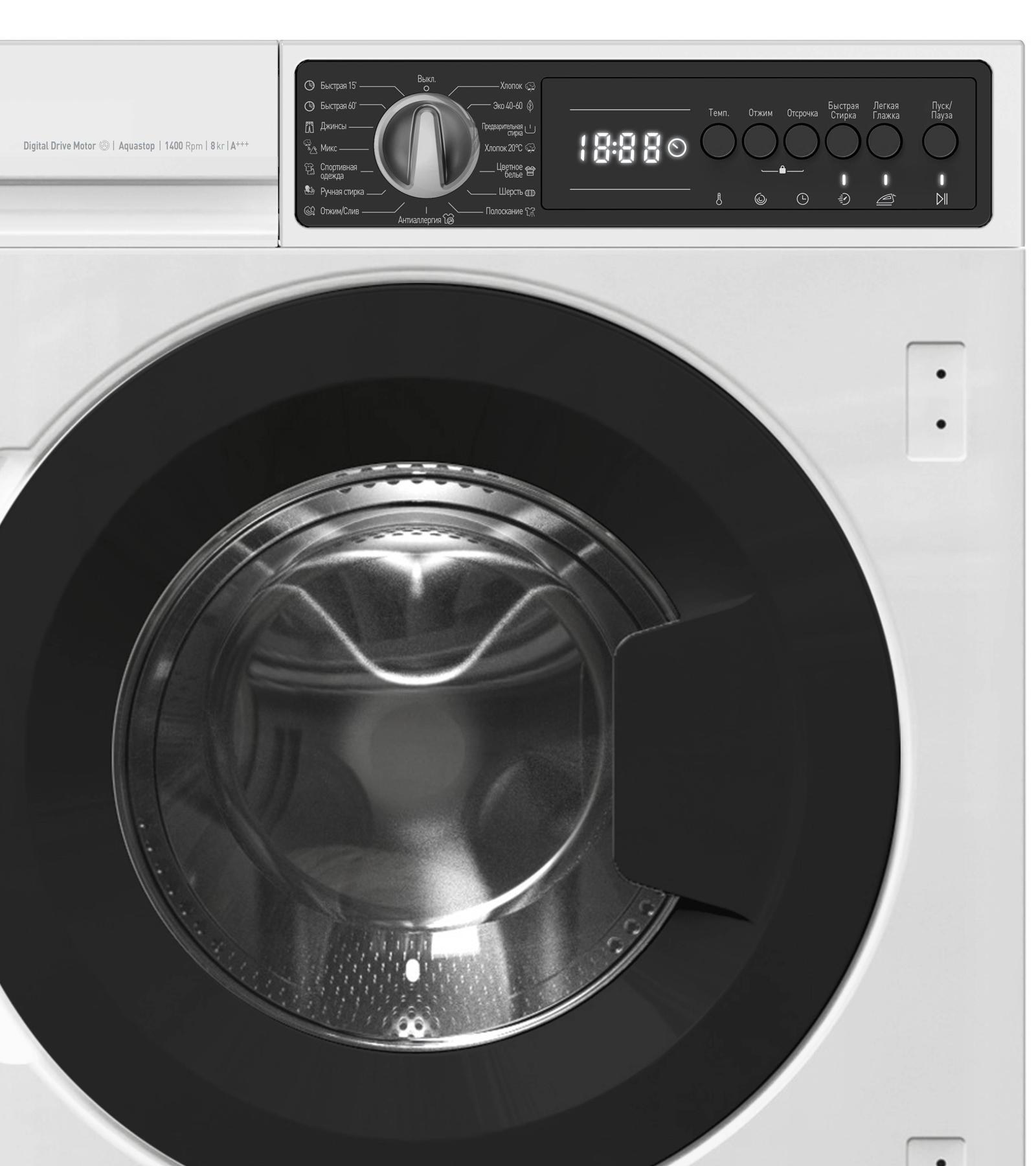 выбор скорости отжима, выбор температуры стирки, интеллектуальное управление стиркой, контроль баланса, контроль за уровнем пены, отложенный старт