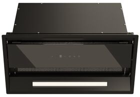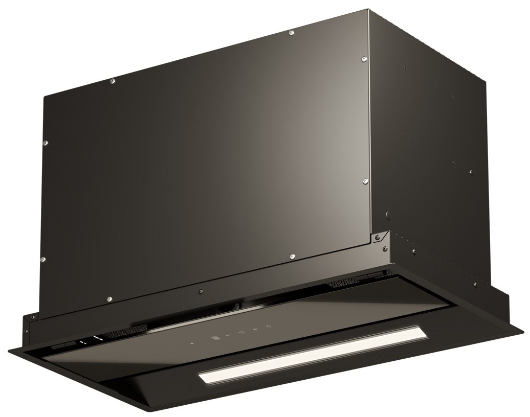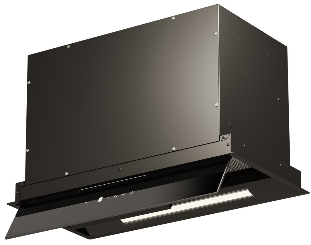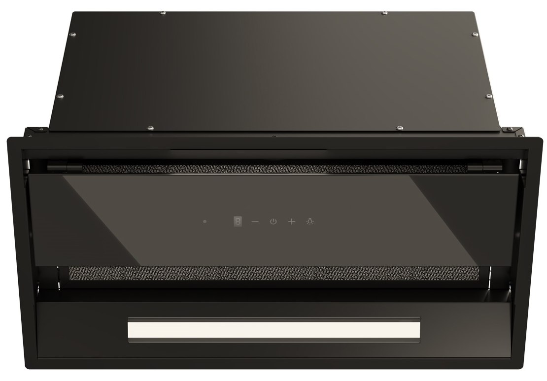 Откидная декоративная панель из закаленного стекла скрывает пятислойный алюминиевый, жироулавливающий фильтр с усиленной конструкцией.