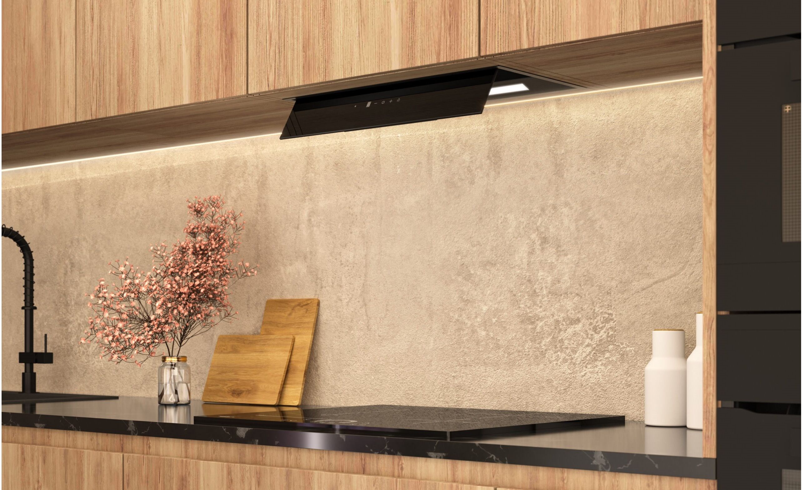 • Откидная панель так же выполняет защитную функцию, оберегает кухонный фасад от попадания пара и оседания частиц флаги во время готовки.