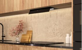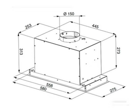 • Вытяжка полностью закрывает нижний горизонт шкафчика и может монтироваться вместо нижней полки. Очень удобная система монтажа, благодаря Т-образному корпусу вытяжки.