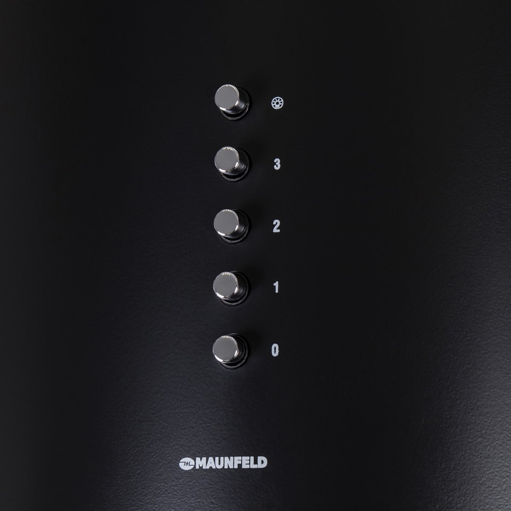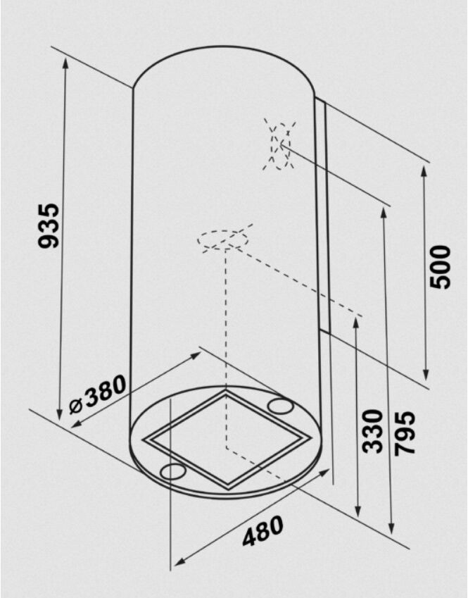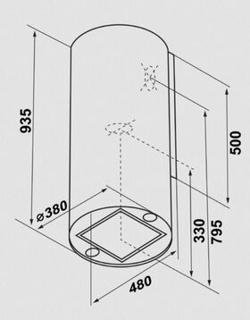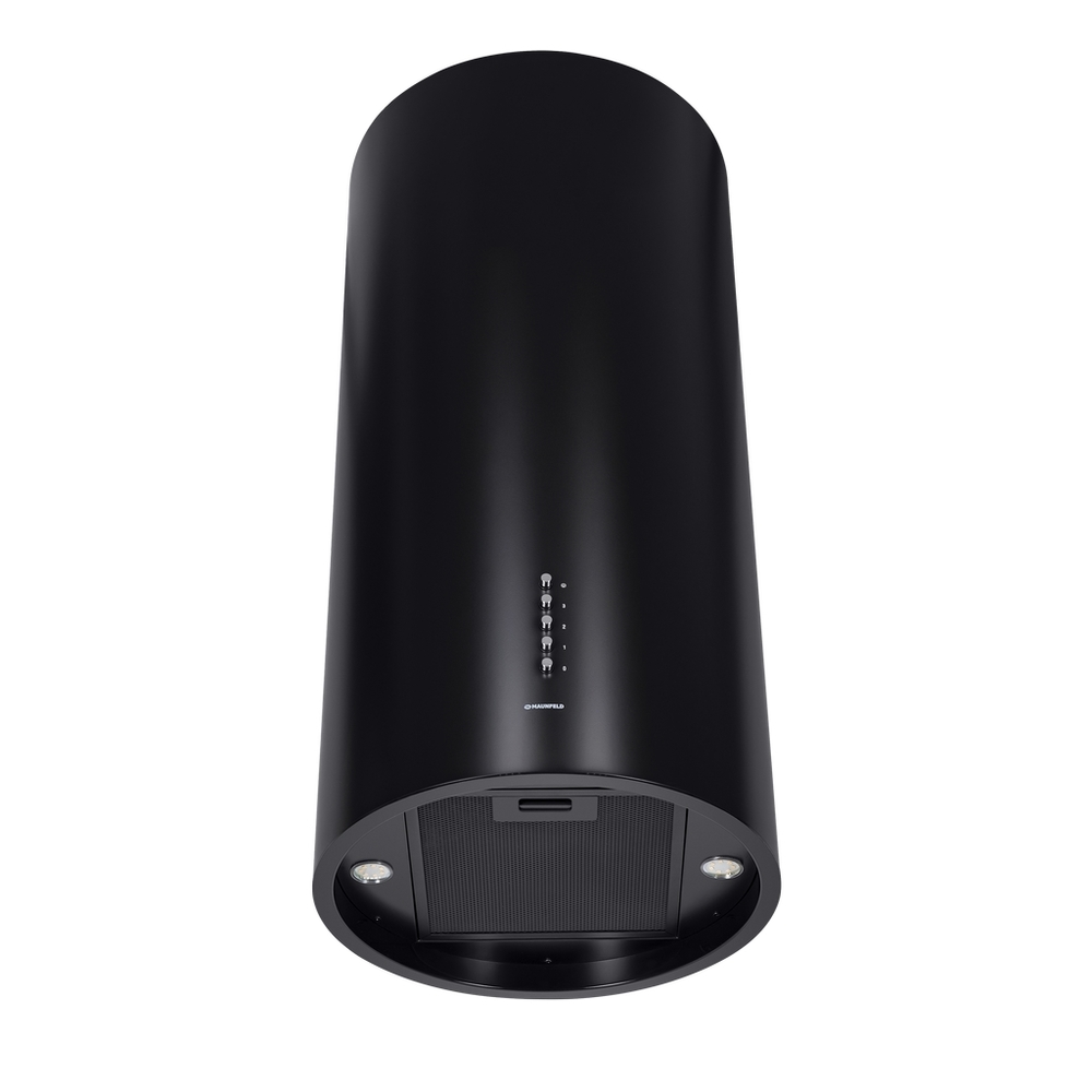 Корпус цилиндрической формы, выполненный из нержавеющей стали с термостойким покрытием черного цвета, монтируется на стене над варочной поверхностью.