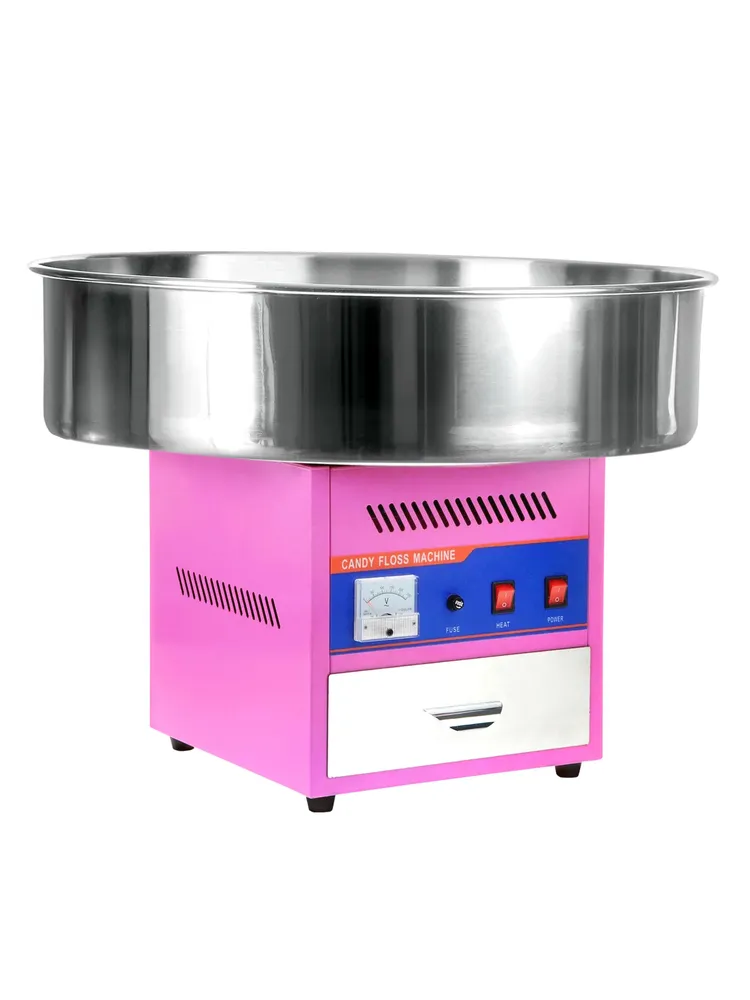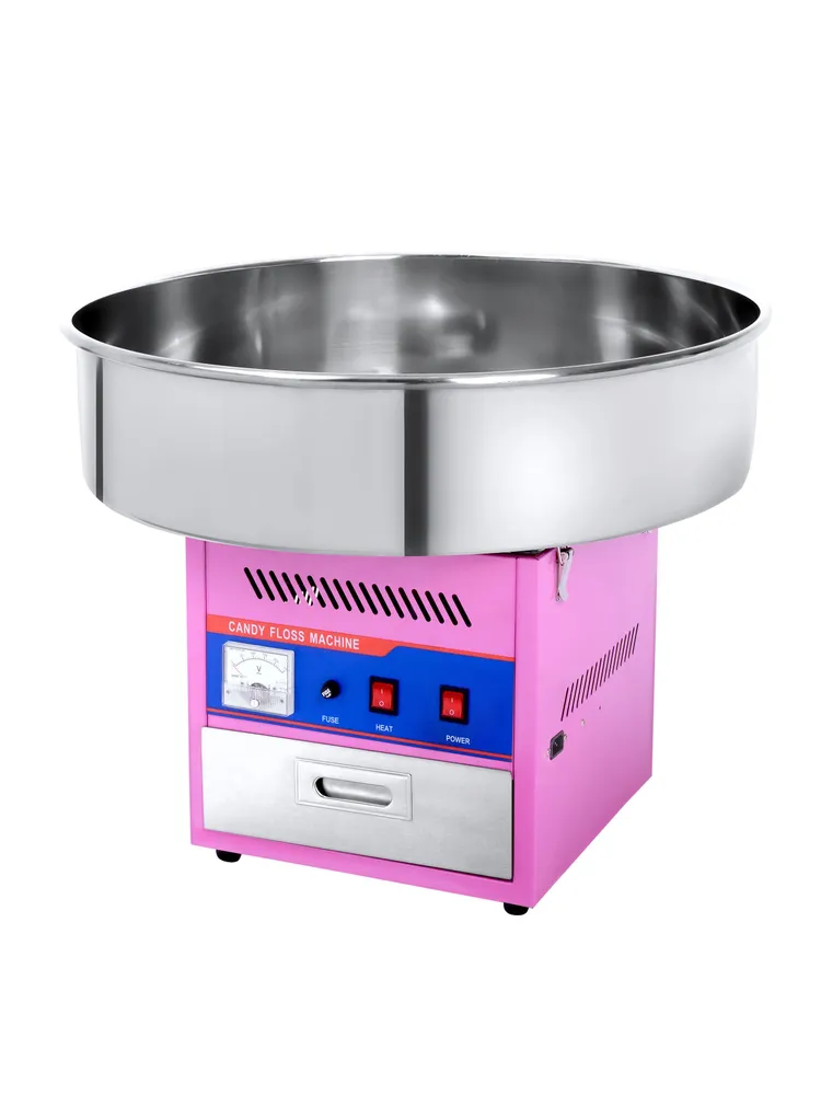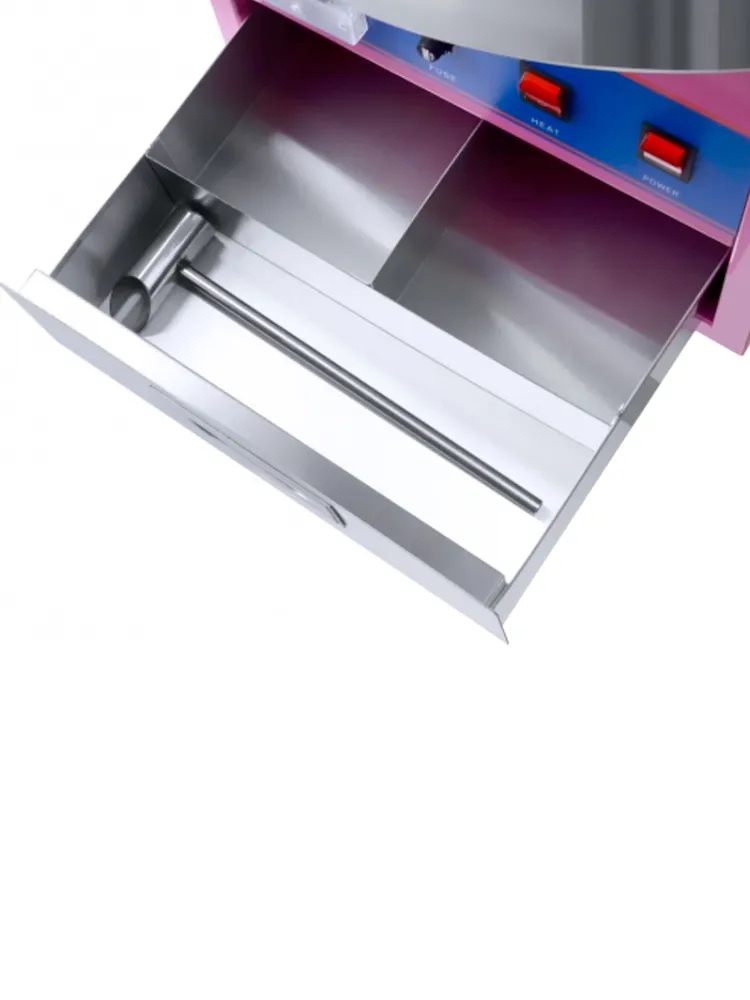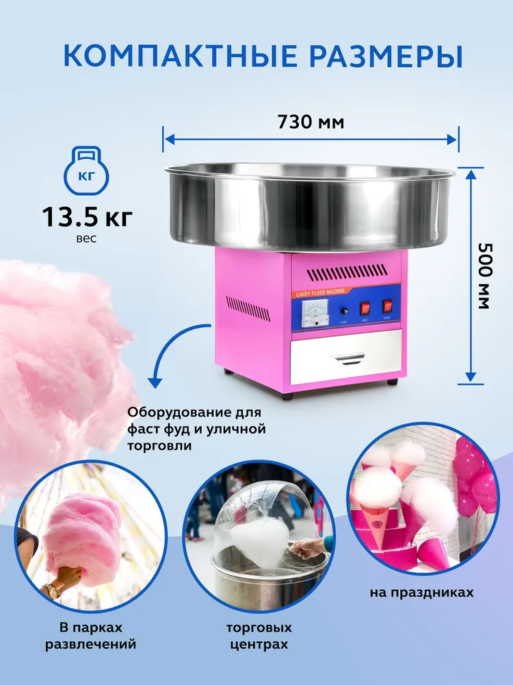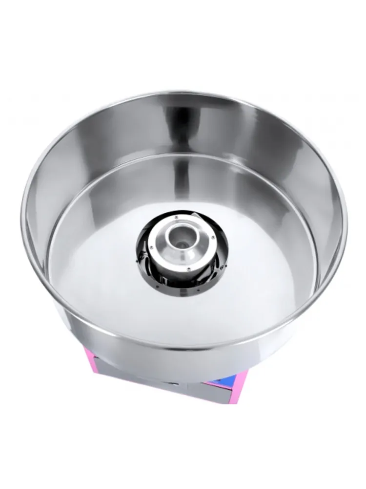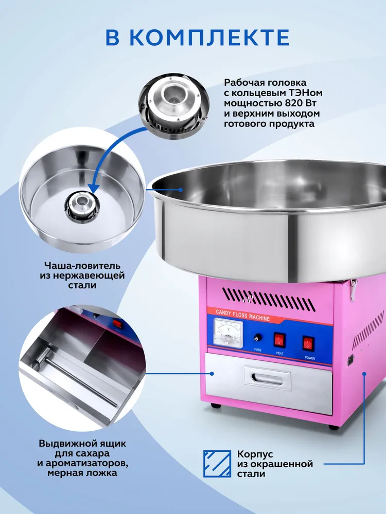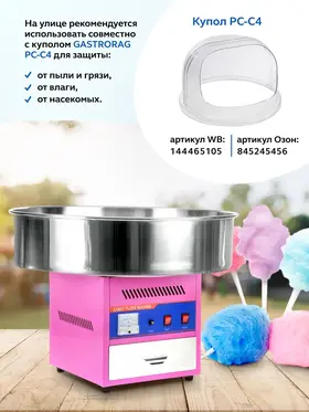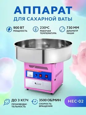 Аппарат для сахарной ваты Gastrorag HEC-02 - это настольный аппарат для сахарной ваты простой и с верхним выходом готовой продукции. Рабочая головка приводится во вращение двигателем постоянного тока (напряжение 12 В, мощность 80 Вт, скорость вращения 3500 об/мин). Нагрев осуществляется кольцевым ТЭНом мощностью 820 Вт. Время выхода аппарата для сладкой ваты на рабочий режим - около 5 минут, производительность - до 3 кг/ч (200 порций по 15 г). Машина для сахарной ваты укомплектована большой и удобной для работы чашей-ловителем диаметром 730 мм из нержавеющей стали, ящиком для сахара и ароматизаторов и мерной ложкой. Материал корпуса - окрашенная сталь.