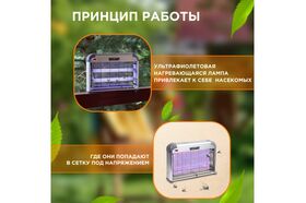Устройство излучает ультрафиолет и нагревается, привлекая насекомых. Подлетая, москиты получают смертельный удар током от металлической сетки под напряжением.