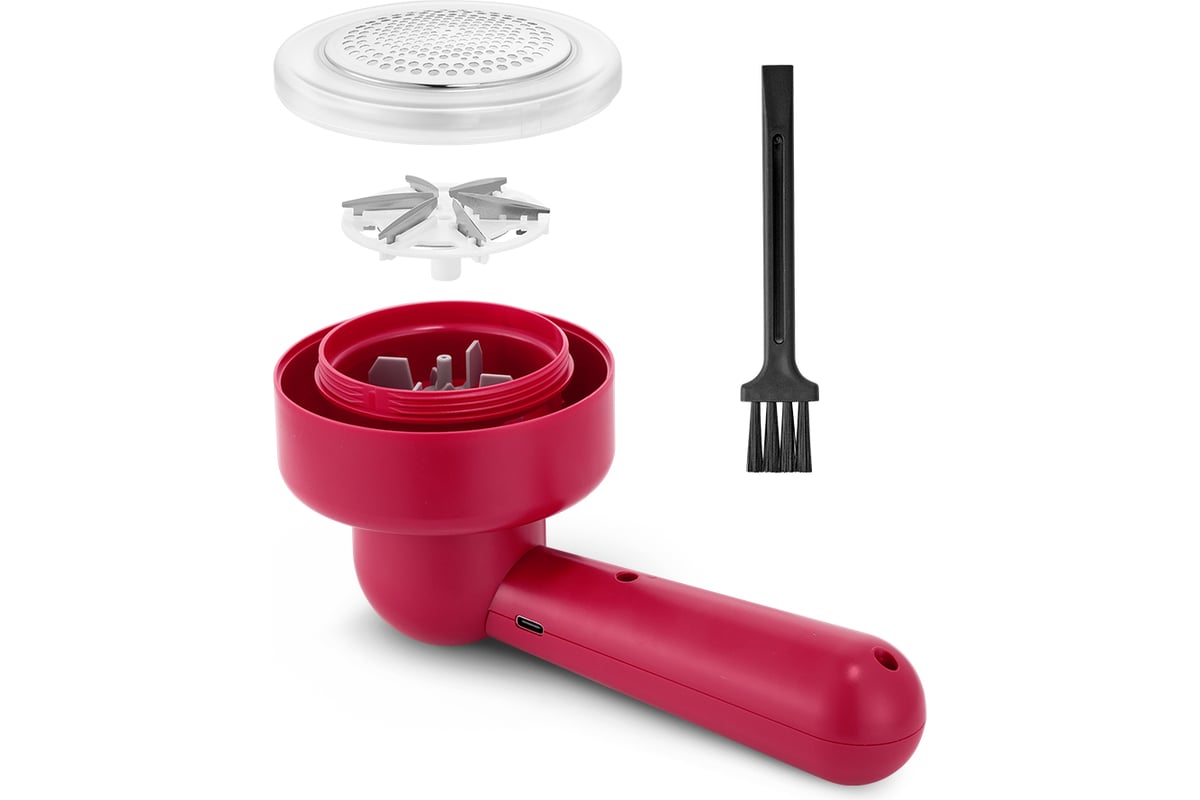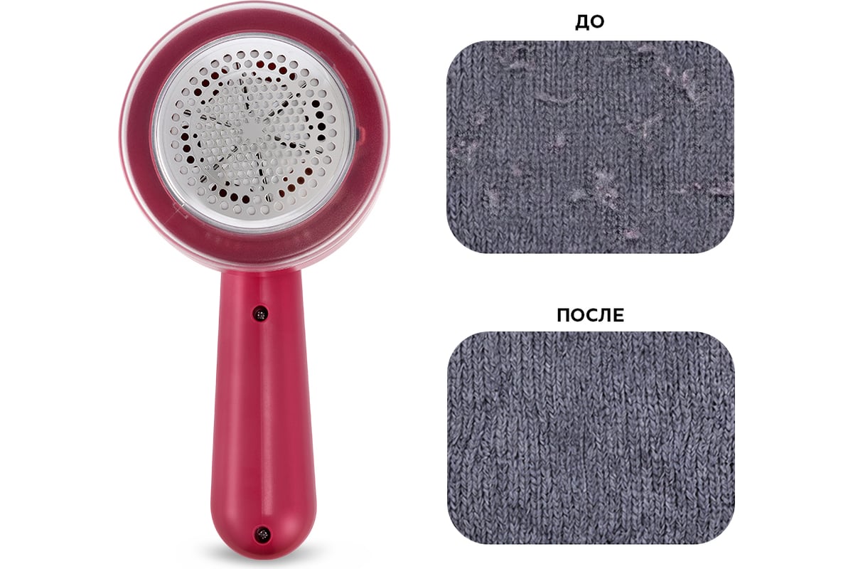 Принцип работы схож с электробритвой — защищенный металлической сеткой блок ножей срезает комки ворса с поверхности ткани. Съемный блок ножей сделан из нержавеющей стали. Комки ворса попадают в контейнер, который нужно очищать после каждого использования. В комплекте идет щеточка, которая предназначена для очистки ножей.