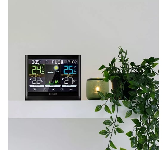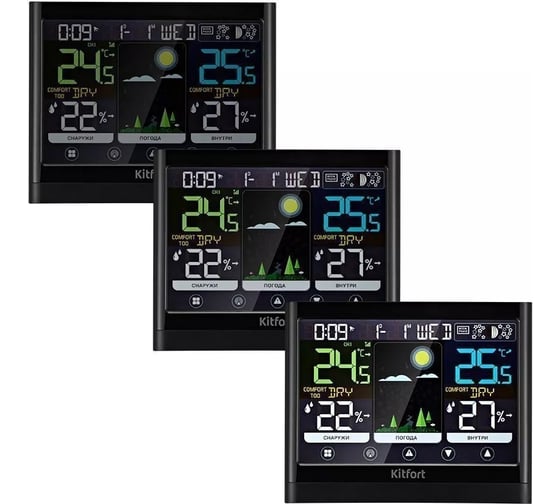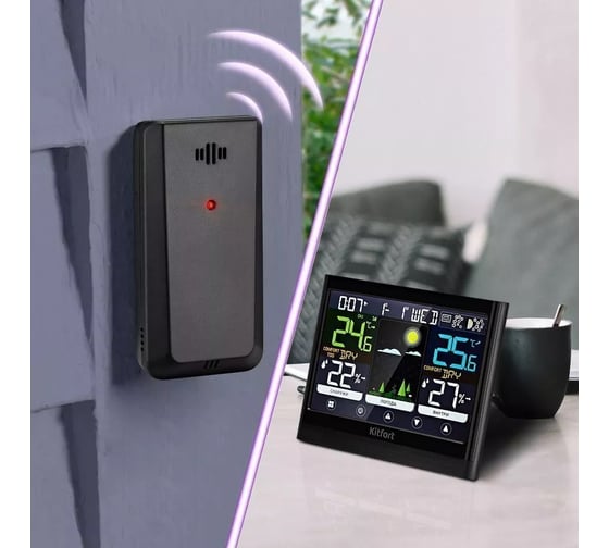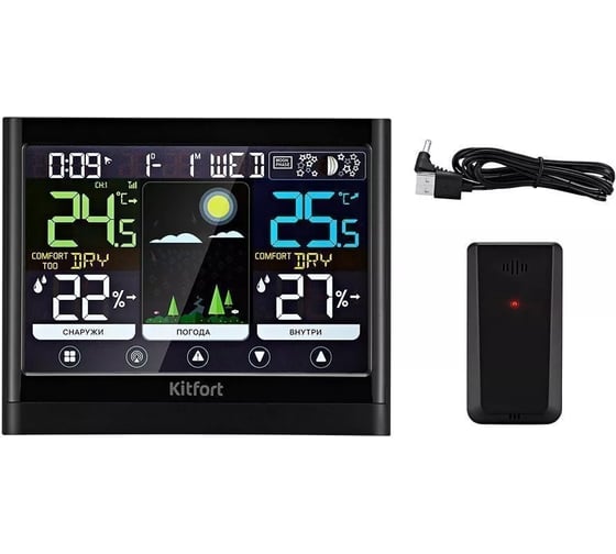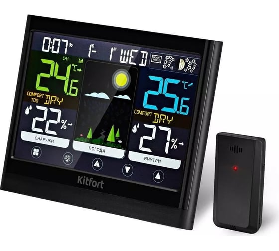 Метеостанция KITFORT КТ-3318 – прибор, который позволит следить за показаниями температуры и влажности в помещении и на улице, фазой луны, погодой. Устройство прогнозирует погодные условия на ближайшие 12–24 часа на основе изменения температуры и влажности.