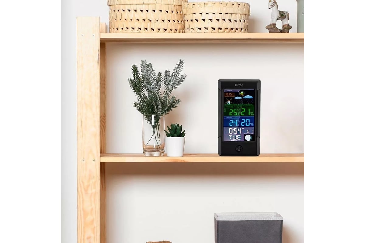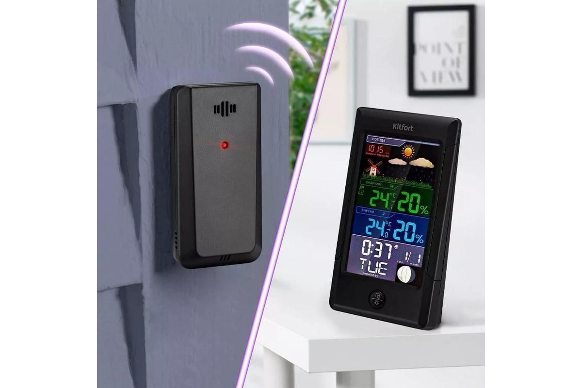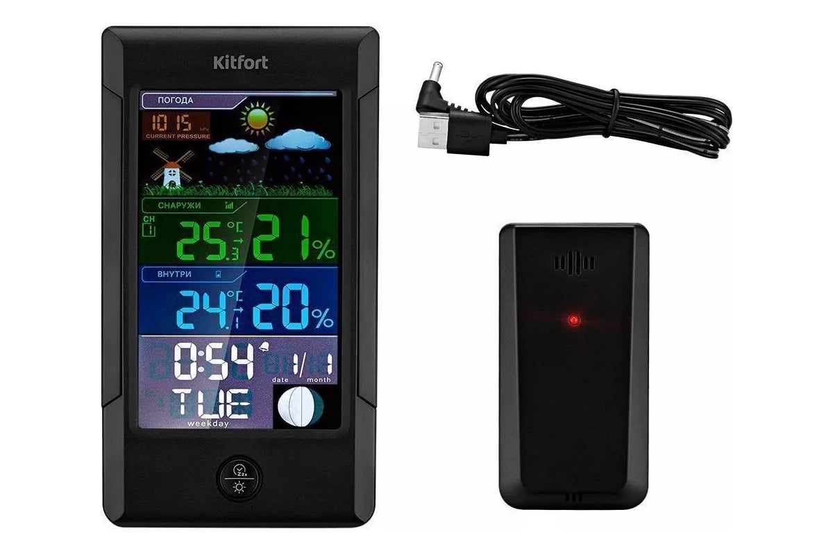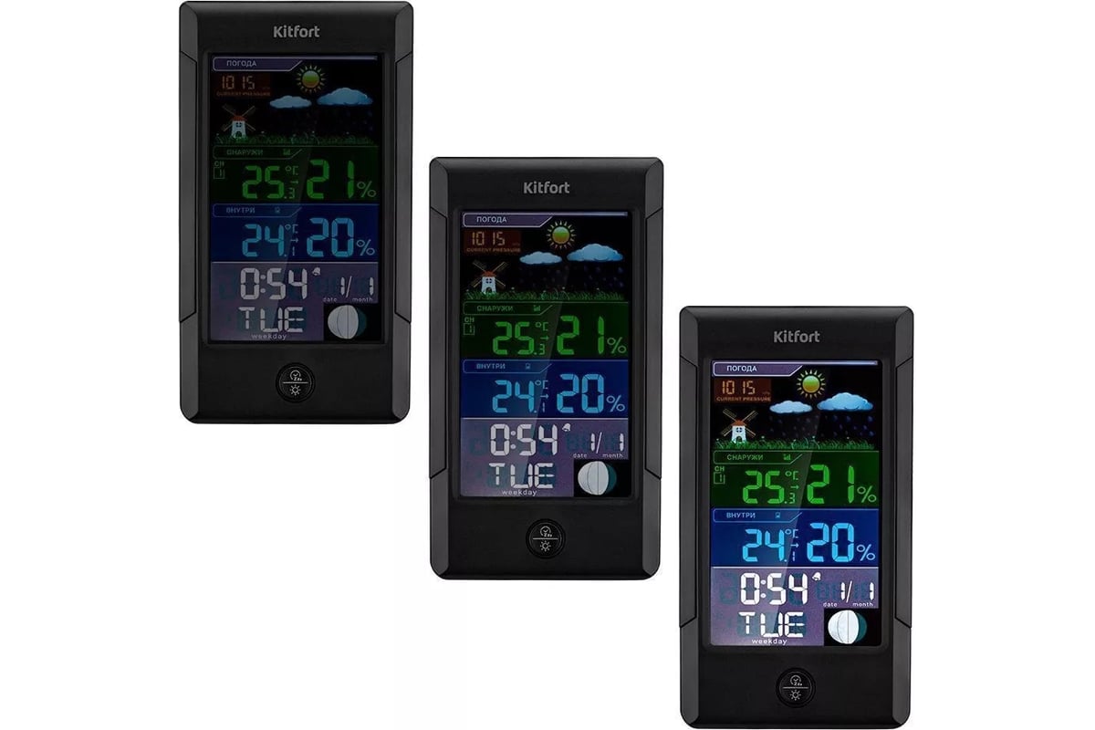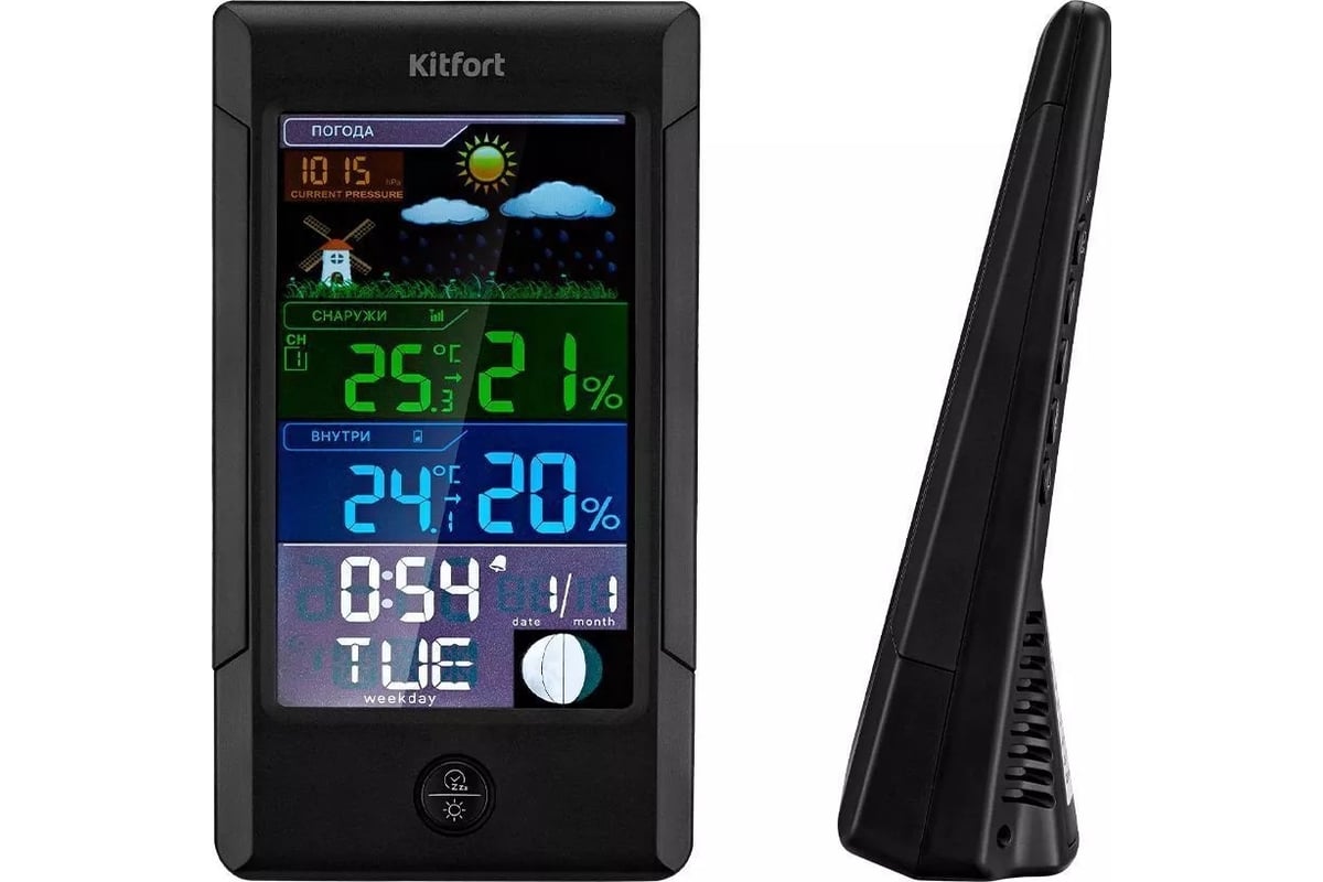 Метеостанция KITFORT КТ-3322 позволит следить за показаниями t и влажности в помещении и на улице, фазой луны, погодой, атмосферным давлением. Устройство прогнозирует погодные условия на ближайшие 12–24 ч на основе изменения атмосферного давления.