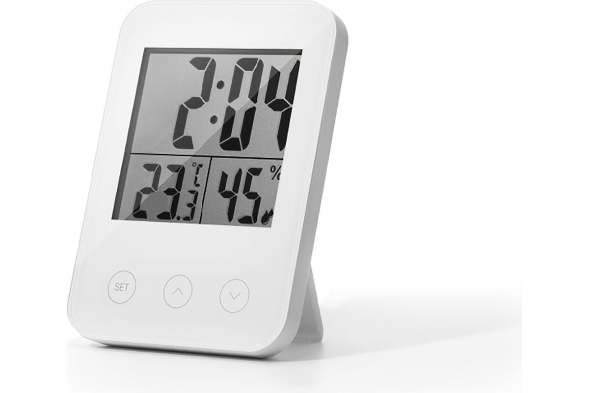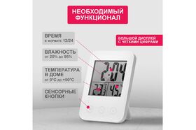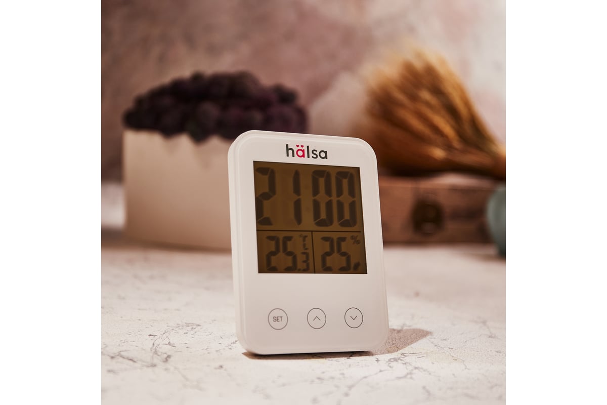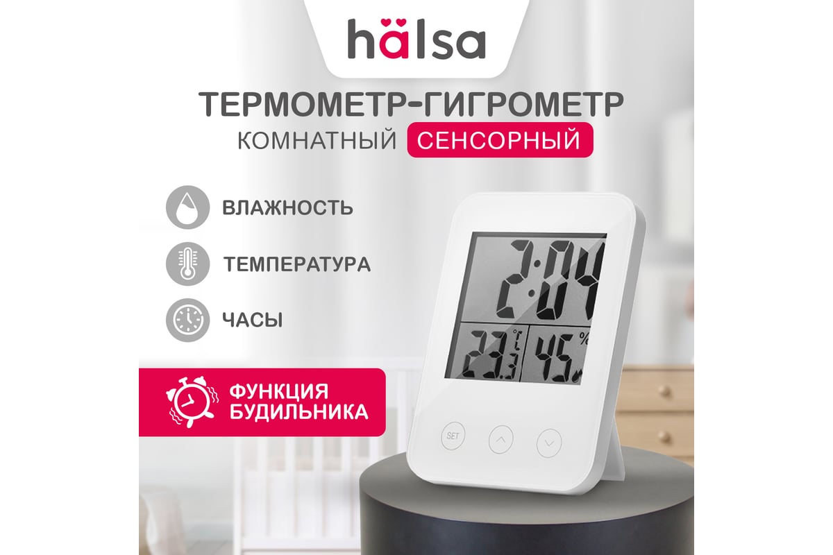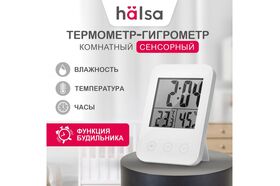 Комнатная метеостанция с часами и датчиком влажности Halsa HLS-E-101 – современный комнатный термогигрометр с сенсорным управлением и большим монохромным цифровым ЖК-дисплеем: данные монитора могут быть четко прочитаны с различной яркостью и углом. На дисплее одновременно отображаются время, температура и влажность.