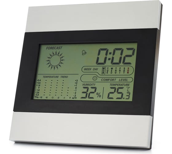 Комнатная метеостанция с памятью, часами и будильником предназначена для измерения показаний температуры в помещении и на улице, комнатной влажности, имеет часы, календарь, функцию будильника.
