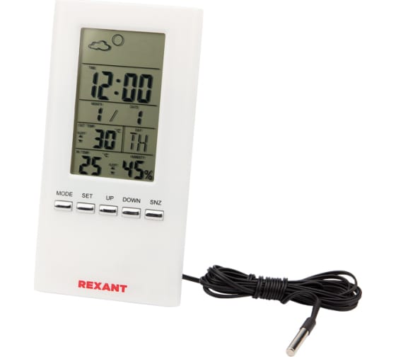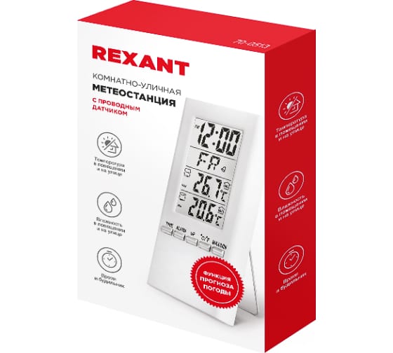 Метеостанция с выносным датчиком предназначена для измерения показаний температуры в помещении и на улице, комнатной влажности, имеет часы, календарь, функцию будильника и прогноза погоды.