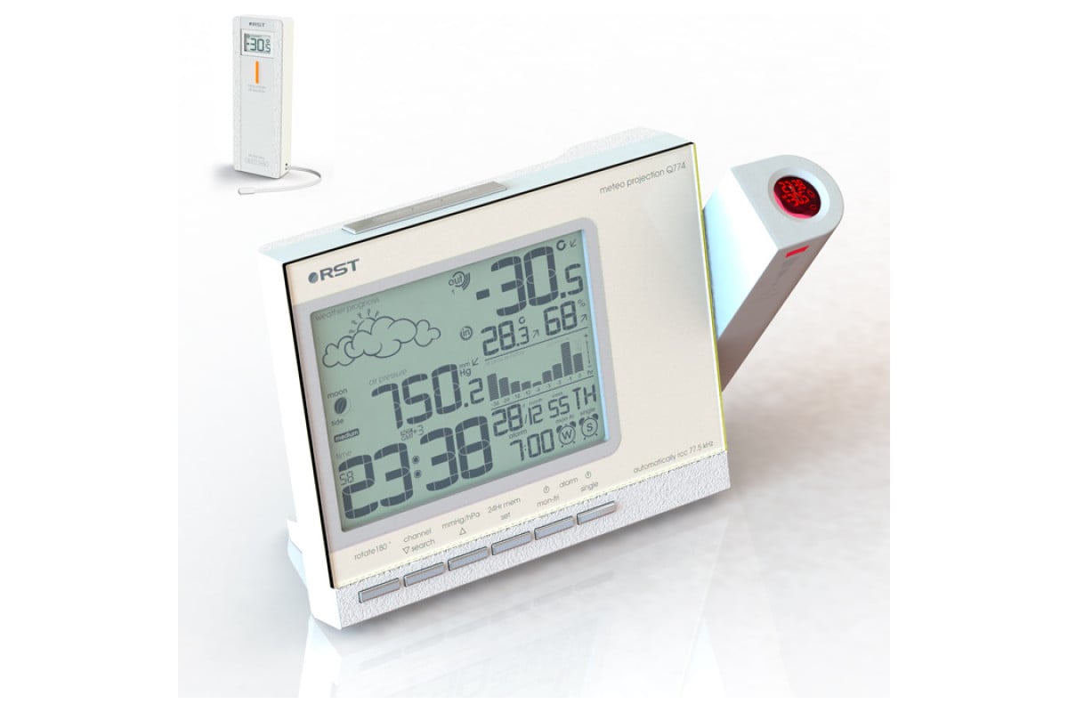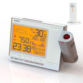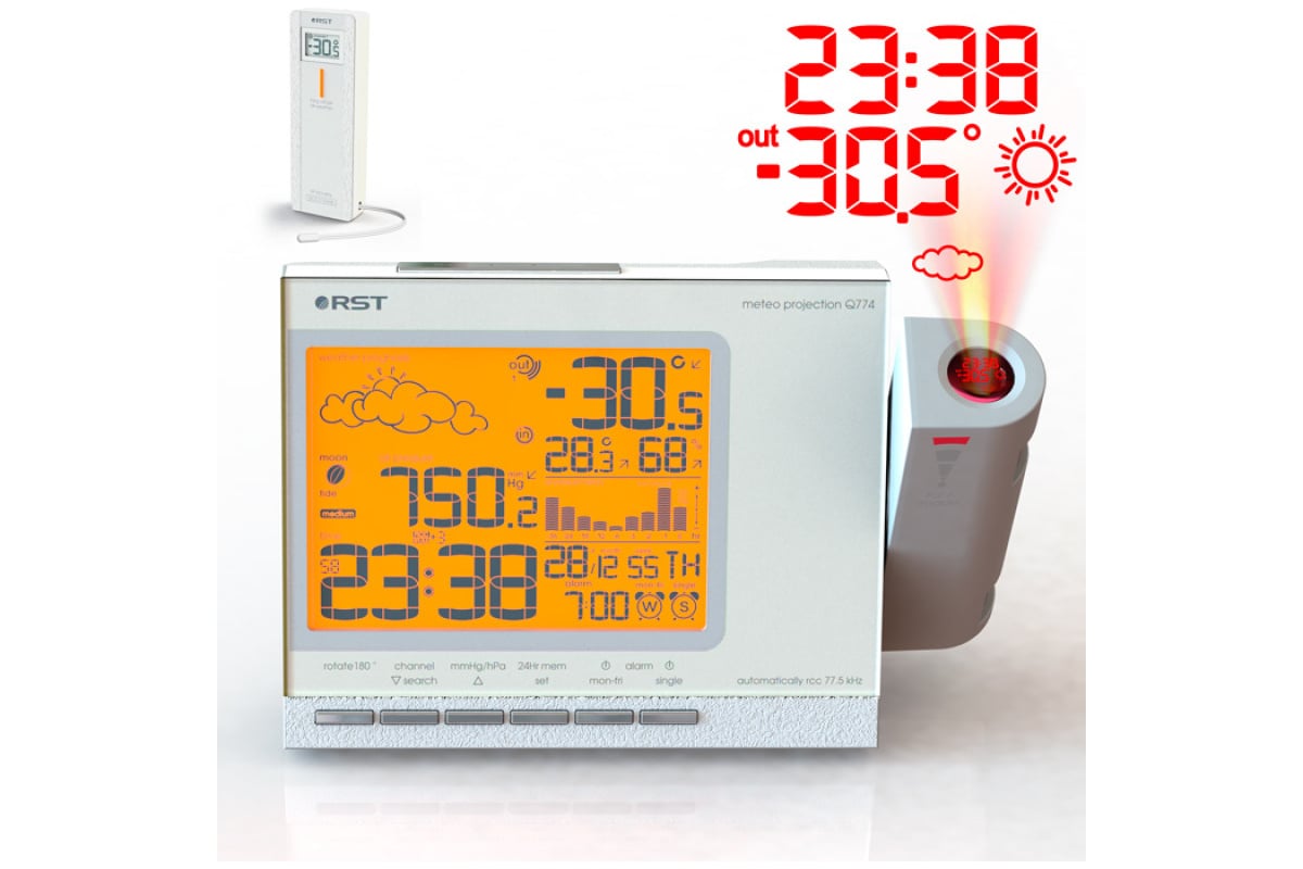 Проекционная метеостанция с дистанционным терморадиодатчиком RST RST32774 предназначена для отображения на потолке или стене в темное время суток показателей точного времени и даты, температуры воздуха в помещении и на улице.