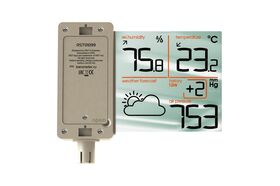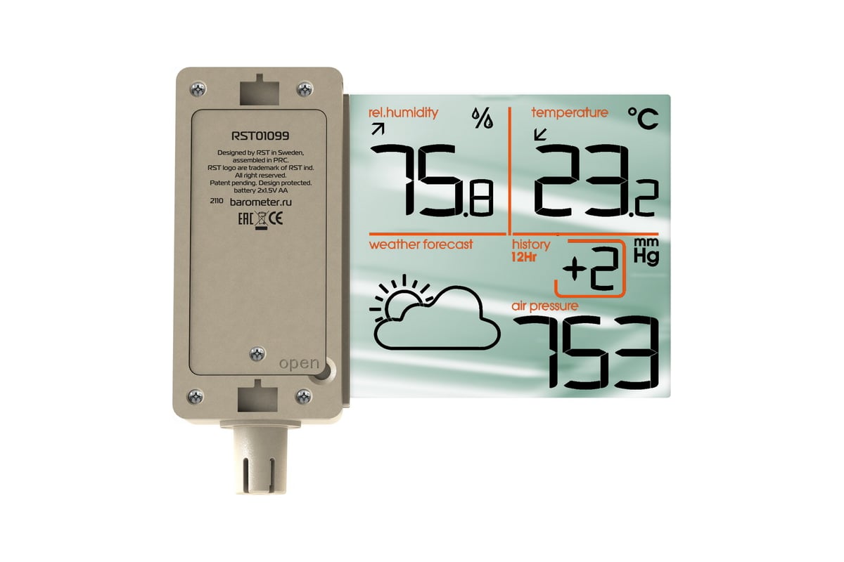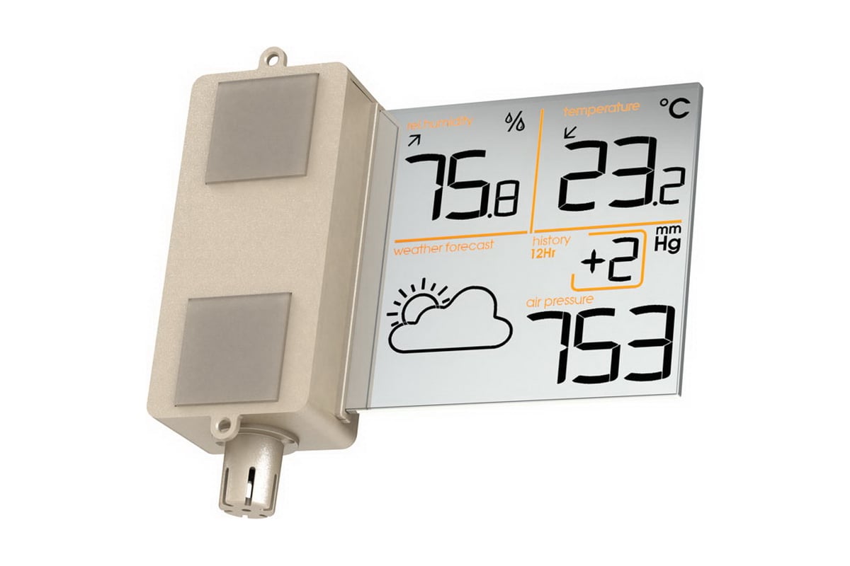 Метеостанция показывает графический прогноз погоды, атмосферное давление в миллиметрах ртутного столба, историю изменения атмосферного давления за прошедшие 12 часов, температуру и влажность воздуха за окном.