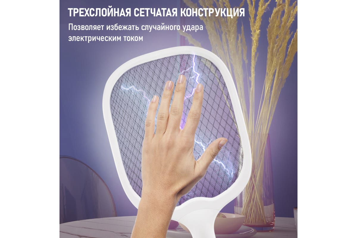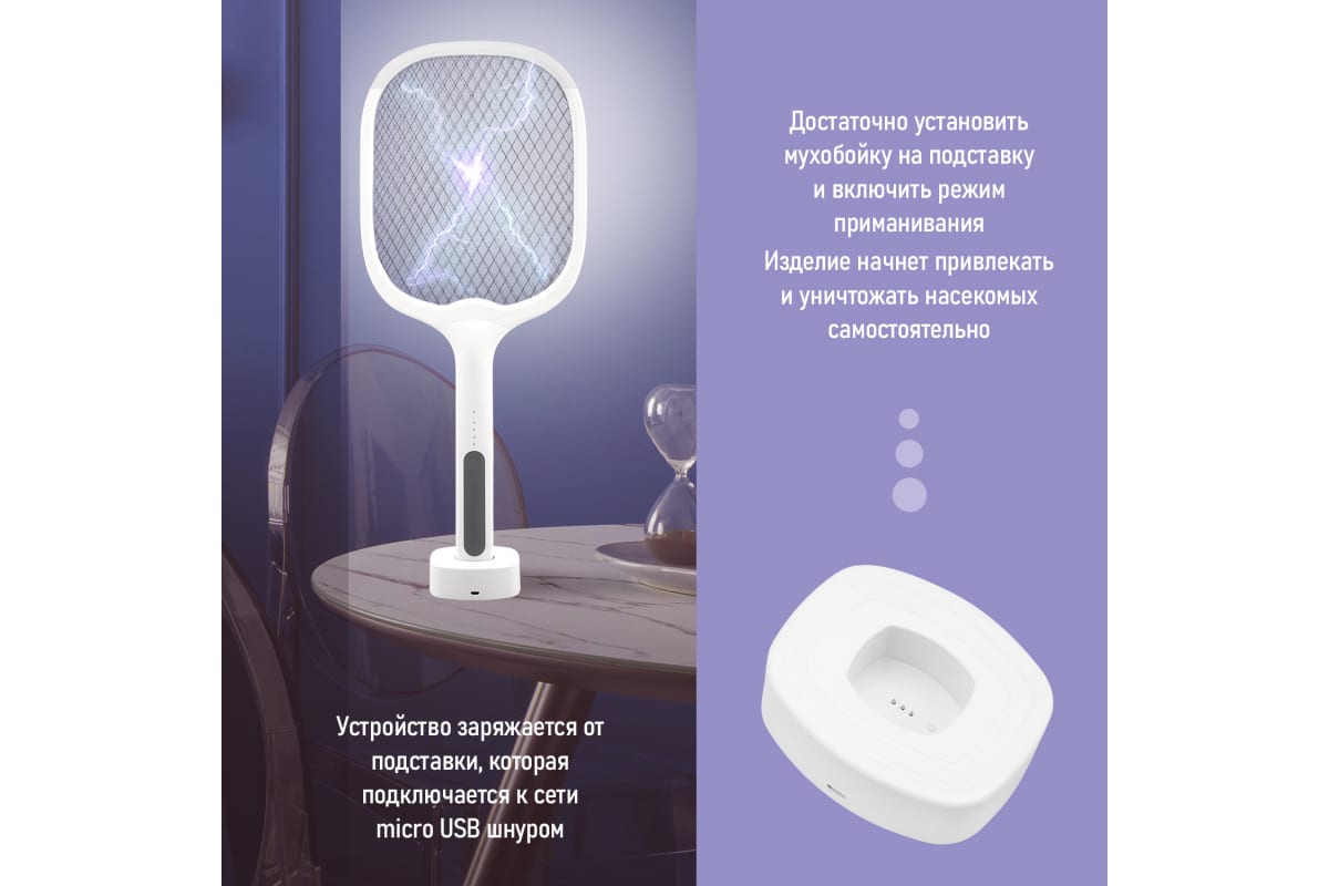 Просто установите данную мухобойку в подставку, входящую в состав комплекта, выберите режим приманивания – и устройство автономно, без участия человека, начнет привлекать насекомых. При контакте с металлической сеткой насекомые получают смертельный разряд током.