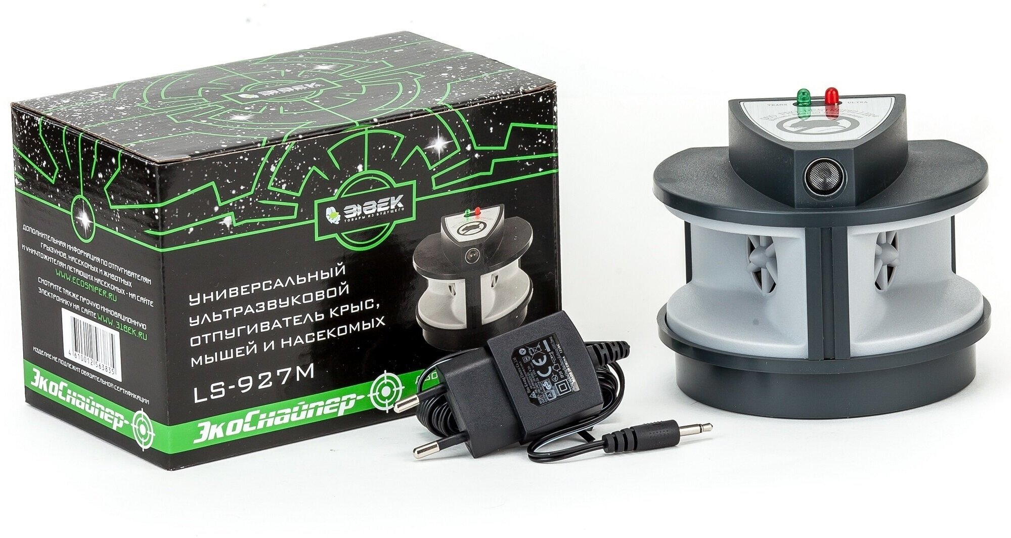 Универсальный ультразвуковой стационарный отпугиватель ЭКОСНАЙПЕР LS-927M– современный и гуманный способ избавления от вредителей. Имеет 2 разнотипных ультразвуковых генератора, повышающих эффективность борьбы с вредителями. Применяется для борьбы с крысами, мышами и другими грызунами, тараканами и насекомыми в закрытых помещениях: дома и на работе, на складах, фабриках, в ресторанах и т.д. Уникальность отпугивателя состоит в том, что попеременное действие разных излучателей, воспроизводящих интенсивные ультразвуковые волны с «плавающей» частотой, оказывает очень мощное угнетающее воздействие на слуховые органы и нервную систему грызунов. Меняющаяся частота динамиков предотвращает привыкание, а также расширяет спектр животных и насекомых, против которых эффективно действует данный прибор. LS-927M — один из самых эффективных приборов среди устройств данного типа. Устройство не использует каких-либо химических реагентов и ядов. Площадь воздействия на открытом пространстве: 468-545 кв.м. Питание: от адаптера 220 В (в комплекте). Размеры: 119х98х98 мм.