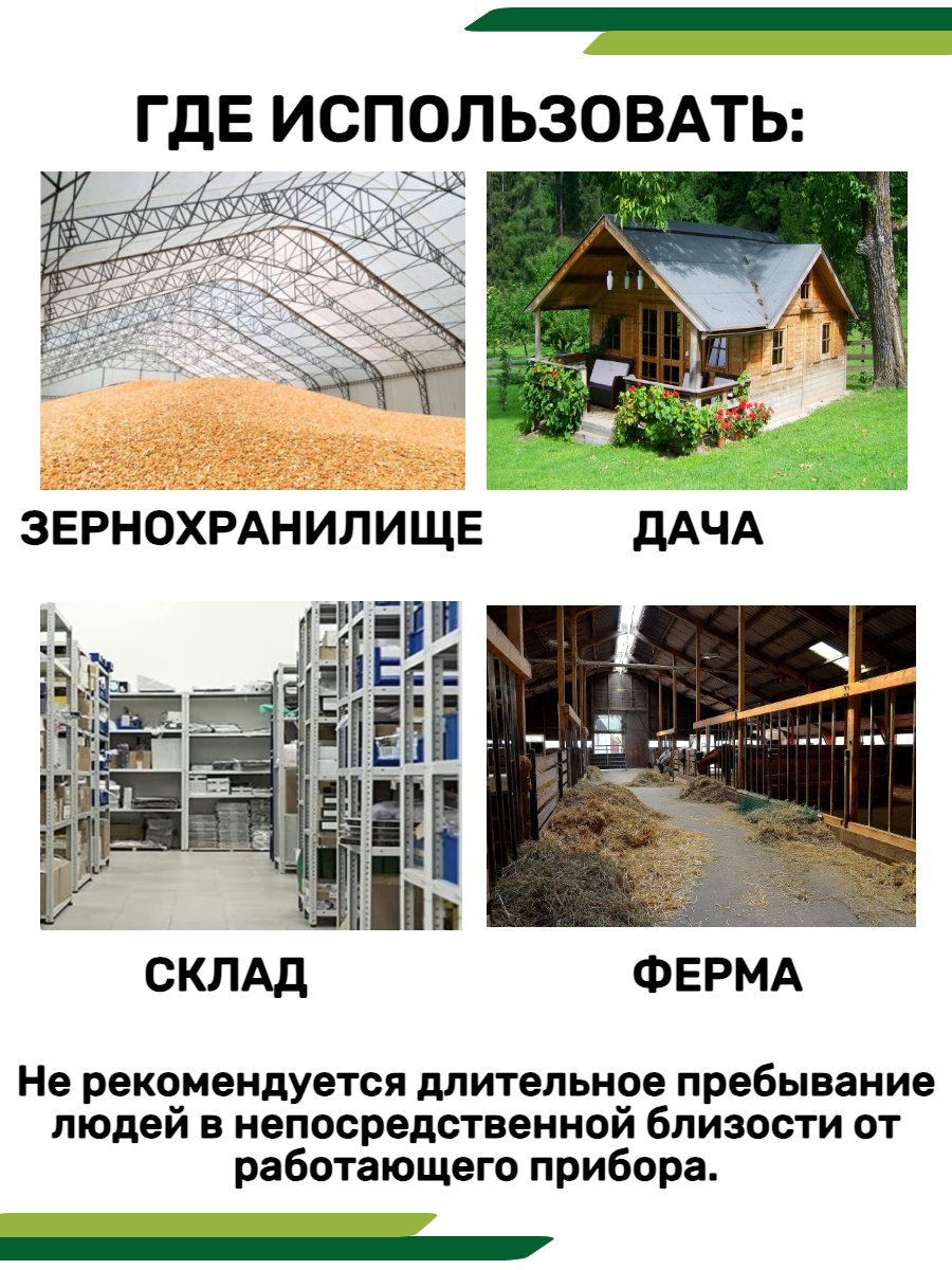 Прибор устанавливается в складах, овоще- и зернохранилищах, подвальных, бытовых и производственных помещениях, домах отдыха, турбазах, птицеводческих и животноводческих комплексах, дачах, трюмах кораблей, торговых предприятиях, отделениях связи, телефонных станциях, офисах и так далее.