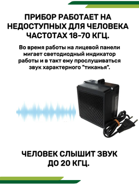 УЗГ имеет автоматическое переключение частоты модуляции и частоты ультразвука в указанном диапазоне. Это не позволит грызунам привыкнуть к излучению прибора.