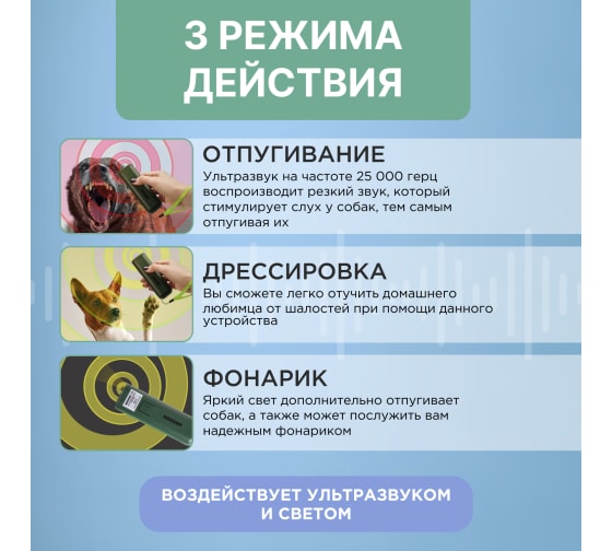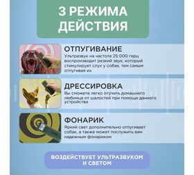 Компактный и легкий прибор без труда поместится в сумочке или кармане. Работает в 3-х режимах: отпугивание, дрессировка, фонарик.