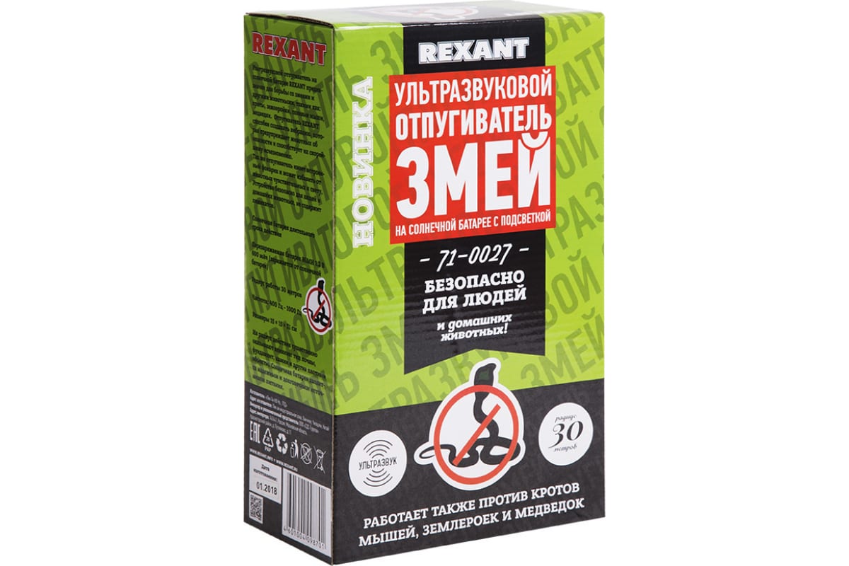 Ультразвуковой отпугиватель REXANT 71-0027 предназначен для борьбы со змеями и другими животными, такими как: кроты, землеройки, полевые мыши, медведки.