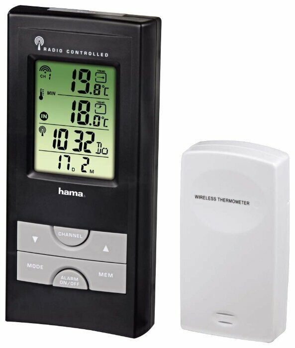 батарейки в комплекте; настройка единиц измерения; сохранение температурных значений; радиус приема сигнала датчика: 30 м; количество датчиков в комплекте: 1; звуковая индикация; максимальное число датчиков: 3; отображение информации: цифры; частота радиоканала: 433,92 МГц; индикация уровня заряда; минимальный интервал передачи сигнала: 45 с; минимальный показатель температуры: -20 °C; максимальный показатель температуры: 60 °C; автоматическая синхронизация DCF-77