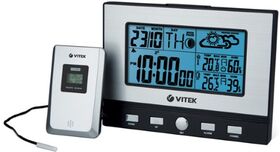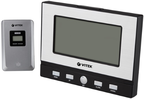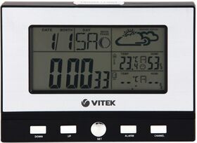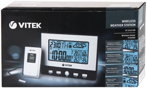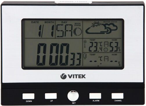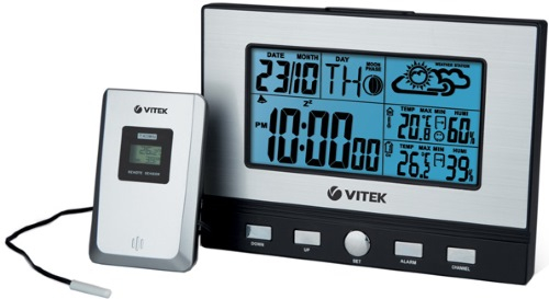 Метеостанция VITEK VT-3533 измеряет температуру внутри помещения и за пределами дома. Определение уровня влажности способствует тщательному контролю показателя: при необходимости это позволяет предпринимать меры для его нормализации. В комплектации предусмотрены основной блок и выносной датчик, который необходимо размещать на улице. Цифровой монохромный дисплей с голубой подсветкой отображает данные, включая фазу луны и прогноз погоды в виде символов.
