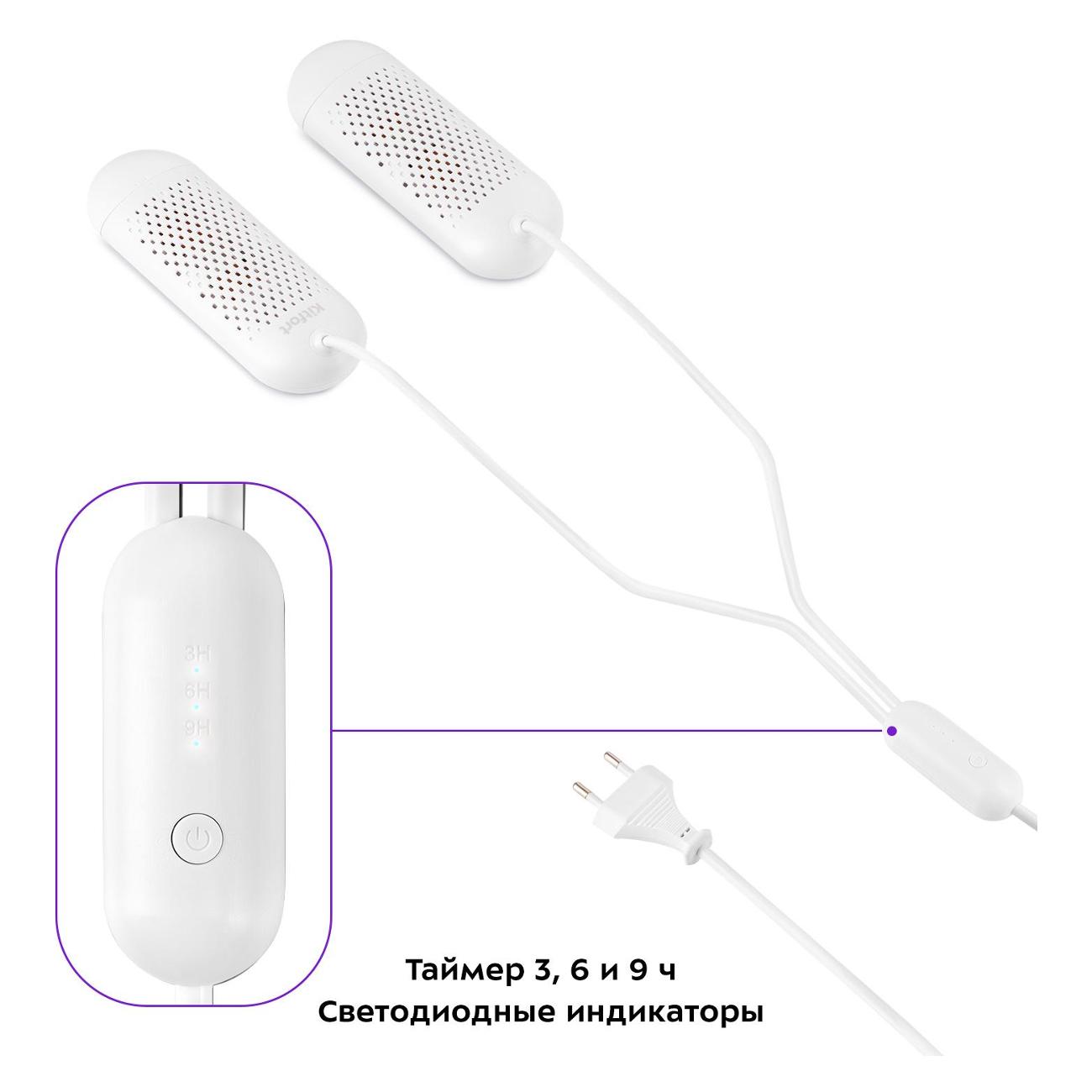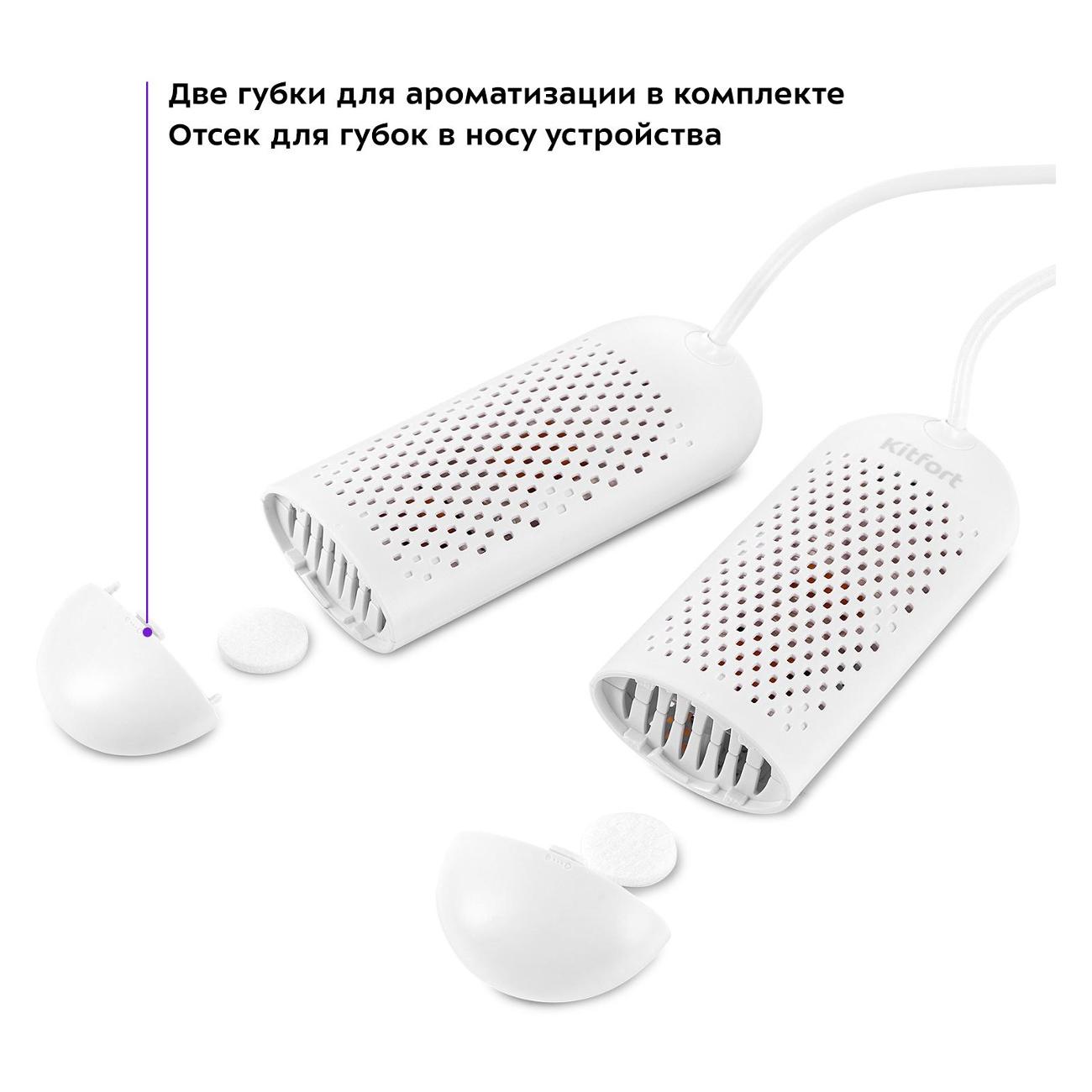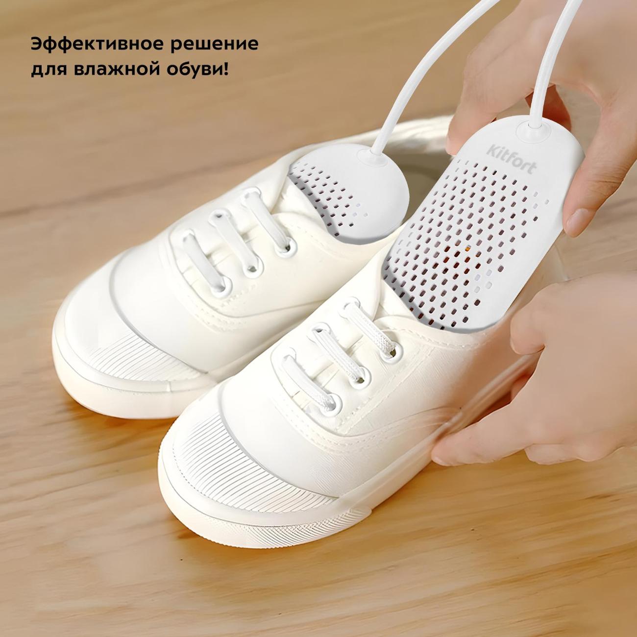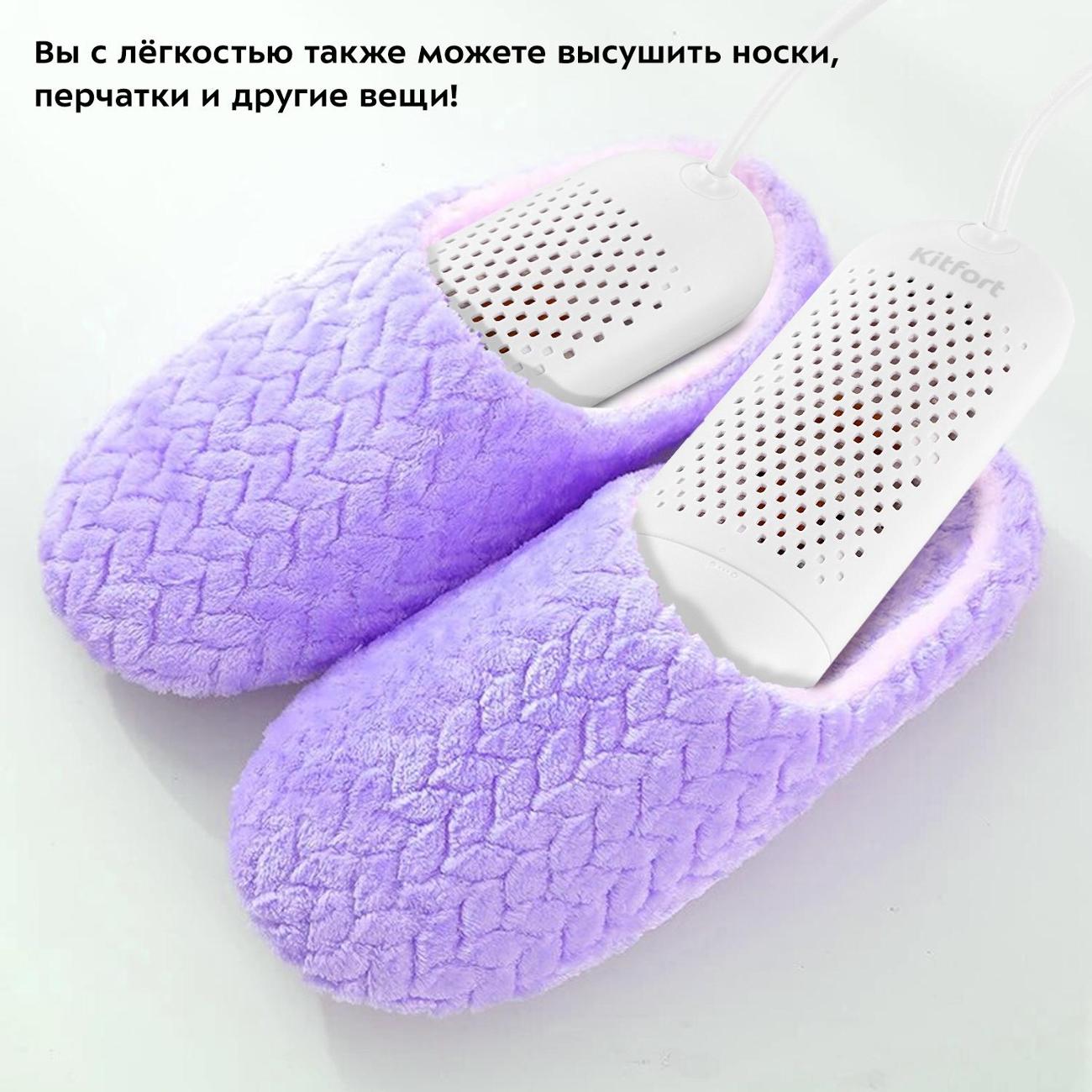 Сушилка для обуви Kitfort КТ-6065-2 — модель в пластиковом корпусе с габаритными размерами — 3х16,5х5,8 см, весом — 233 г. Устройство способно быстро высушивать любую промокшую обувь и решить проблему влажной поверхности от вспотевших ног, что уменьшает риск развития грибка. Встроенный таймер дает возможность настраивать время работы на 3, 6 и 9 часов. Светодиодный индикатор показывает рабочее состояние.