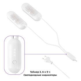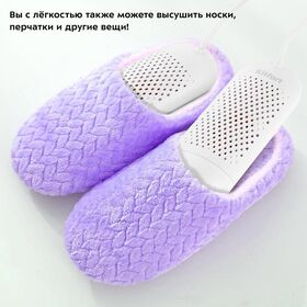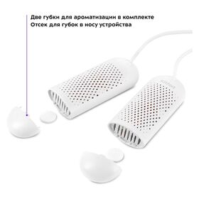 Конструкцией предусмотрено большое количество отверстий, позволяющие равномерно распределять по всему объему тепло до 75°С. Устройство плотно фиксируется в обуви более 27 размера. При необходимости под крышку корпуса сушилки можно подкладывать губку с парой капель эфирных масел, которые придают обуви легкий приятный аромат. Длина сетевого шнура равна 1,4 м.