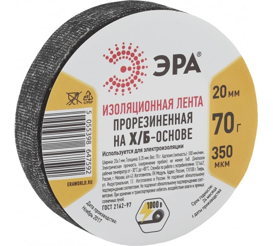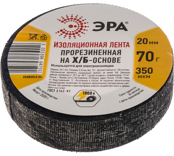 Технические характеристики изоленты ЭРА Х/Б 70 г 20мм/350мкм