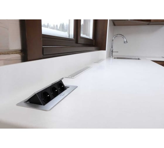На розетках установлены шторки, так же над поверхностью столешницы остается рамка 2 мм, которая предотвращает затекание воды внутрь механизма