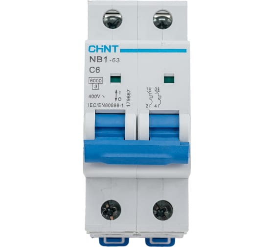 Автоматический выключатель CHINT NB1-63 2P 6A 6кА характеристика C 179667 используется для защиты распределительных и групповых цепей от перегрузок и короткого замыкания. Применяется во вводно-распределительных щитах жилых и административных зданий или в промышленности.
