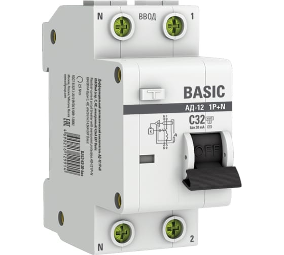 Преимущества EKF Basic АД-12 1P+N 32А 30мА тип АС, х-ка C, 4,5кА DA12-32-30-bas