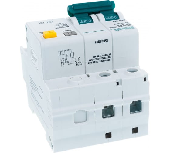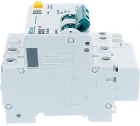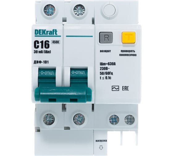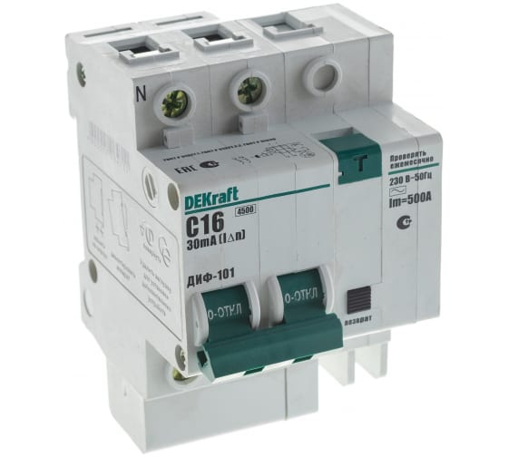Автоматический выключатель дифференциального тока ДИФ101-2Р-016А-030-C DEKraft 15003DEK 121961 имеет встроенную защиту от сверхтоков, представляет собой сочетание автоматического включателя и электронного блока дифференциальной защиты (УЗО). Левая часть аппарата работает как автомат, а правая - как УЗО, при этом неважно, какой именно блок сработал - цепь всё равно разрывается случае возникновения короткого замыкания, перегрузки и утечки тока ( в т. ч. при случайном соприкосновении рук человека с токоведущими частями).