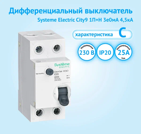 Технические характеристики Systeme Electric City9 set авдт 1p+n с 40а 4.5ka 30ма тип-aс 230в C9D34640