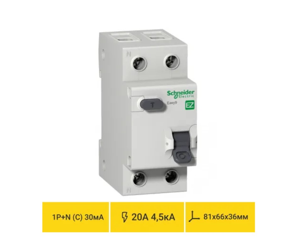 Автоматический выключатель дифференциального тока (АВДТ) серии Easy9 Schneider Electric ,1P + N, номинальный ток 20 А, характеристика С, Icn = 4.5 кА, ток утечки 30 мА, тип АС. АВДТ применяется в однофазных сетях напряжением до 230В.