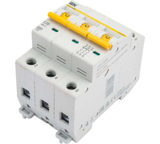 Автоматический выключатель IEK ВА47-60M 3Р 20А 6кА С MVA31-3-020-C выполняет функции автоматического отключения электроустановки при появлении сверхтоков и оперативного управления участками электрических цепей.
