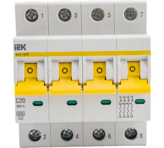 Автоматический выключатель IEK ВА47-60M 4Р 20А 6кА С MVA31-4-020-C выполняет функции автоматического отключения электроустановки при появлении сверхтоков и оперативного управления участками электрических цепей.