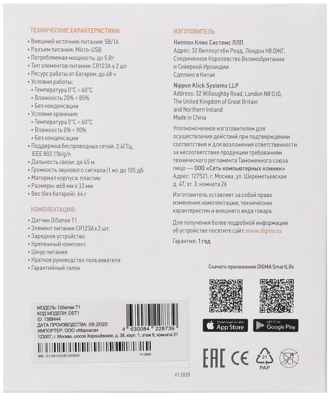 Комплект поставкиДатчик DiSense T1, зарядное устройство, крепежный комплект, шнур питания, краткое руководство пользователя, гарантийный талонМатериалы